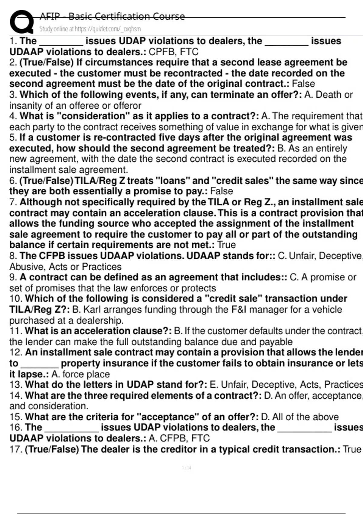 The ________ issues UDAP violations to dealers, the ________ issues UDAAP violations to dealers.: CPFB, FTC 2. (True/False) If circumstances require that a second lease agreement be executed - the customer must be recontracted - the date recorded on the second agreement must be the date of the original contract.: False 3. Which of the following events, if any, can terminate an offer?: A. Death or insanity of an offeree or offeror 4. What is "consideration" as it applies to a contract?: A. The requirement that each party to the contract receives something of value in exchange for what is given 5. If a cust