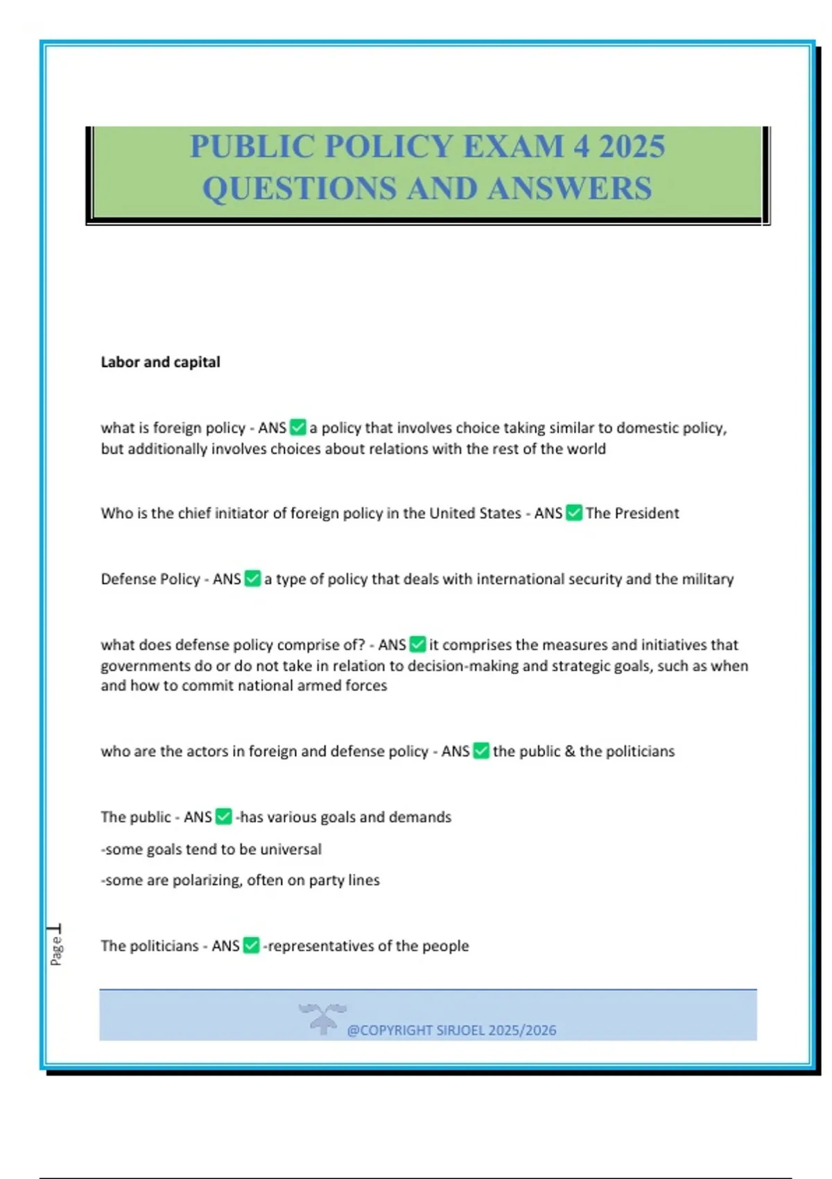 Labor and capital what is foreign policy - ANS a policy that involves choice taking similar to domestic policy, but additionally involves choices about relations with the rest of the world Who is the chief initiator of foreign policy in the United States - ANS The President Defense Policy - ANS a type of policy that deals with international security and the military what does defense policy comprise of? - ANS it comprises the measures and initiatives that governments do or do not take in relation to decision-making and strategic goals, such as when and how to commit national armed forces who are the actors in foreign and defense policy - ANS the public & the politicians The public - ANS -has various goals and demands -some goals tend to be universal -some are polarizing, often on party lines The politicians - ANS -representatives of the people PUBLIC POLICY EXAM 4 2025 QUESTIONS AND ANSWERS @COPYRIGHT SIRJOEL 2025/2026 Page2 -charged with representing American interests -Congress (two terms) -Senate (6 year terms) -President ( 4 year terms) How many terms is congress, senate, and the president - ANS congress=2 senate=6 president=4 who is the principle and who is the agent in foreign policy - ANS principle=the public agent=political Leaders Principles: The Public - ANS -bosses -they have preferred foreign and defense options -they vote for leaders who they believe will carry out their interests Agents: Political Leaders - ANS -subordinates -charged with carrying out the will of the principles what are the principle agent problems in foreign policy and defense policy - ANS 1. Information Asymmetry 2. Adverse selection 3. Moral Hazard information asymmetry - ANS the principle is unable to see what the agent is actually doing exp: boss and emplo