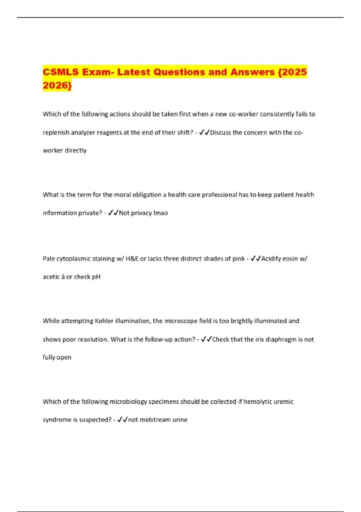 CSMLS Exam- Latest Questions and Answers {}