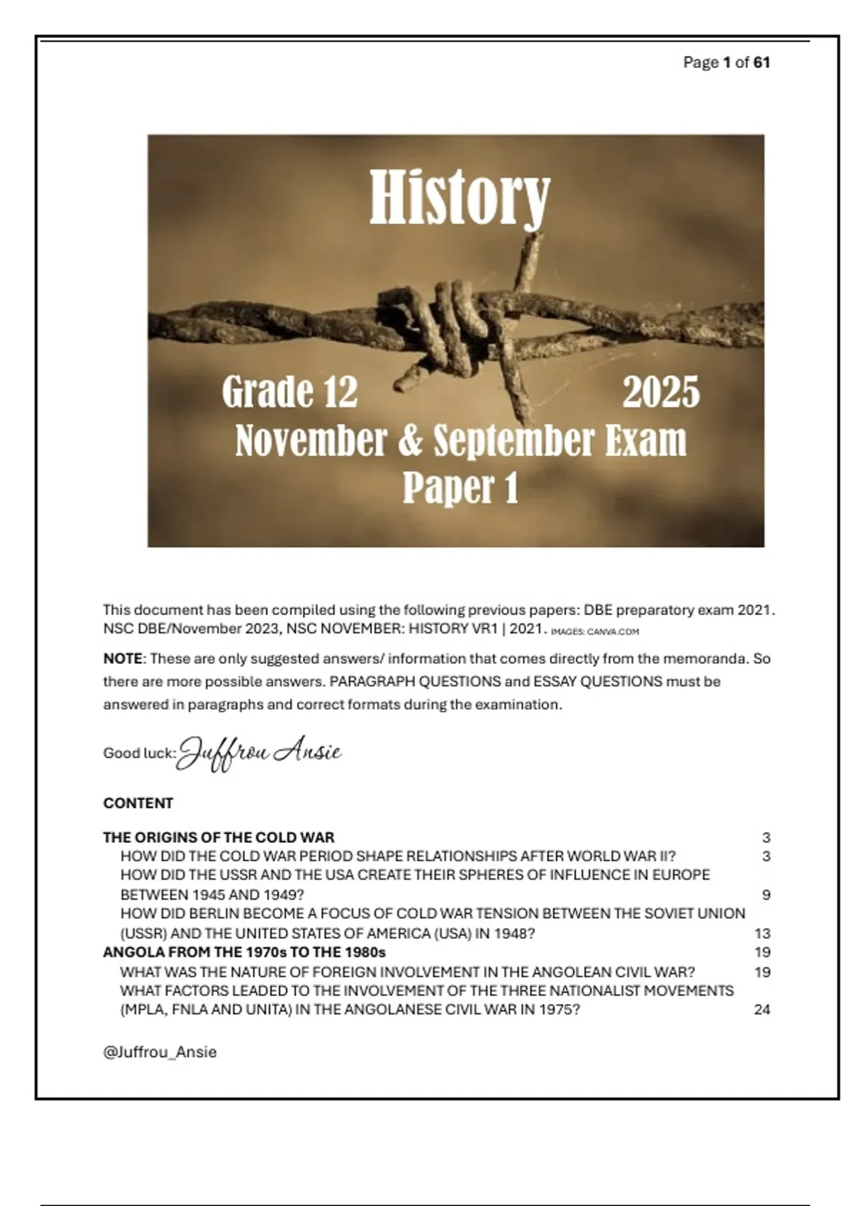 Grade 12 History – Paper 1 (2025) Be exam-ready with these CAPS-aligned study packs compiled by using past papers. Covers: Paper 1: The Cold War • China under Mao • Civil Rights in the USA. Features: Based on past exam papers Source-based + essay practice Suggested memo-style answers Perfect for learners, teachers & parents supporting Grade 12 exam prep.