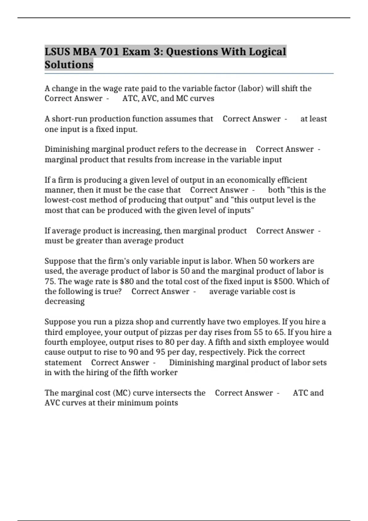 statement Correct Answer - Diminishing marginal product of labor sets
