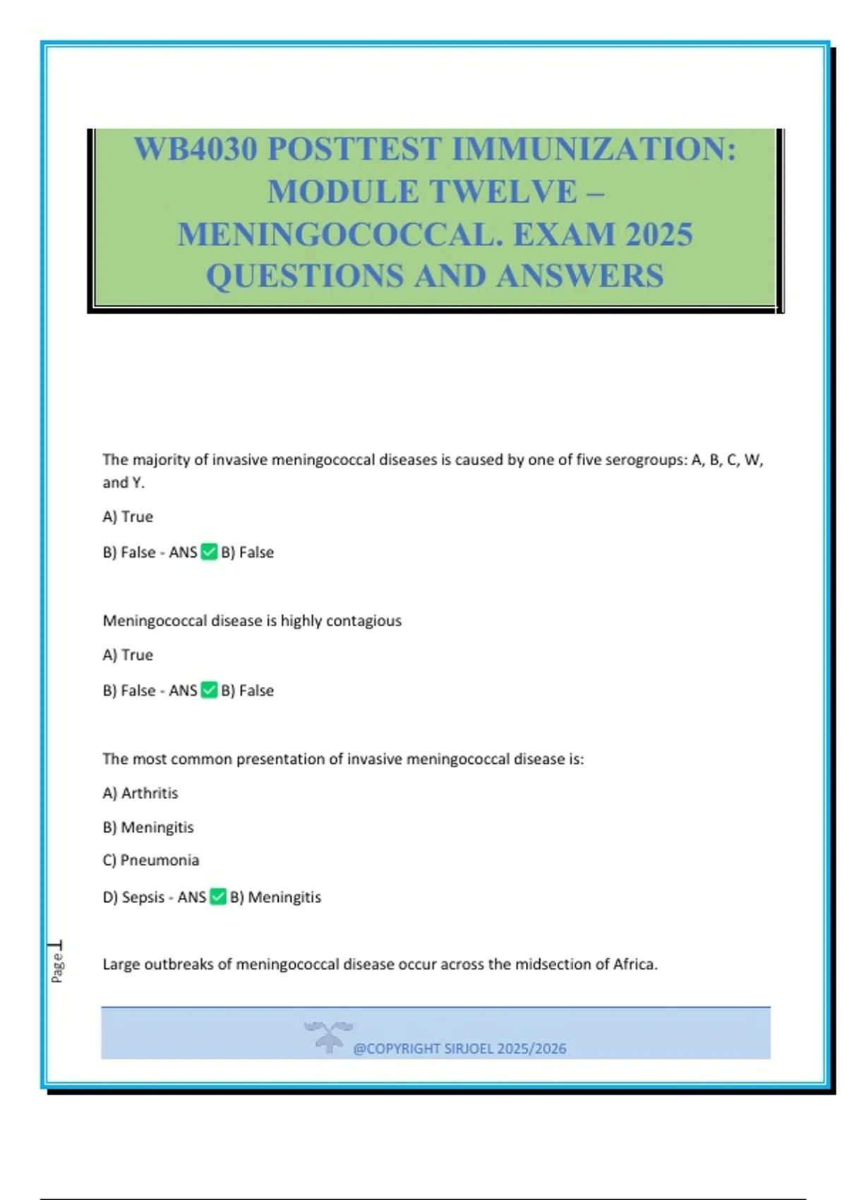 WB4030 POSTTEST IMMUNIZATION: MODULE TWELVE – MENINGOCOCCAL. EXAM 2025 QUESTIONS AND ANSWERS
