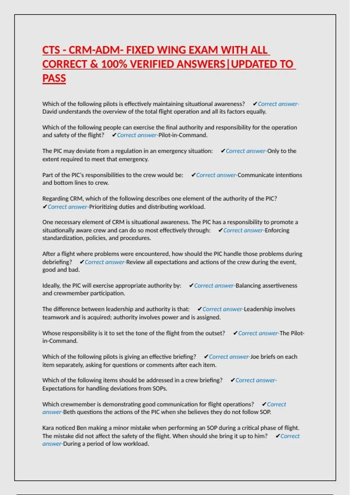 CTS - CRM-ADM- FIXED WING EXAM WITH ALL CORRECT & 100% VERIFIED ANSWERS|UPDATED TO PASS