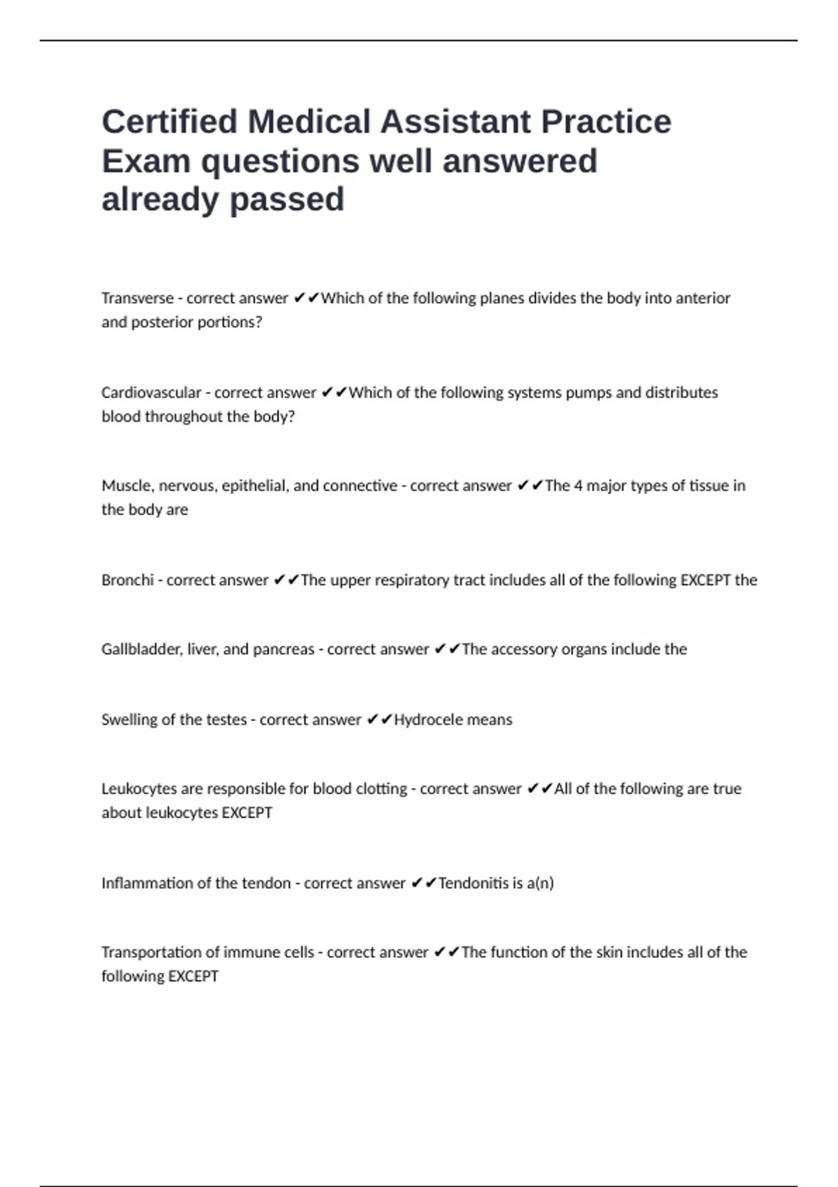 Certified Medical Assistant Practice Exam questions well answered already passed Transverse - correct answer Which of the following planes divides the body into anterior and posterior portions? Cardiovascular - correct answer Which of the following systems pumps and distributes blood throughout the body? Muscle, nervous, epithelial, and connective - correct answer The 4 major types of tissue in the body are Bronchi - correct answer The upper respiratory tract includes all of the following EXCEPT the Gallbladder, liver, and pancreas - correct answer The accessory organs include the Swelling of the testes - correct answer Hydrocele means Leukocytes are responsible for blood clotting - correct answer All of the following are true about leukocytes EXCEPT