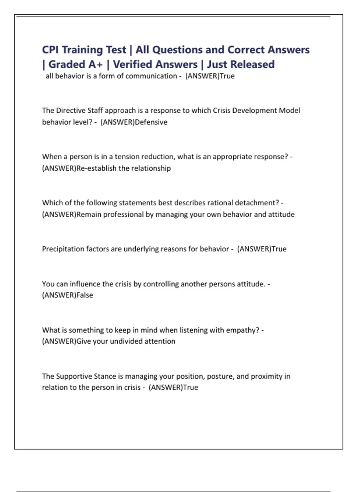 CPI Training Test | All Questions and Correct Answers | Graded A+ | Verified Answers | Just Released