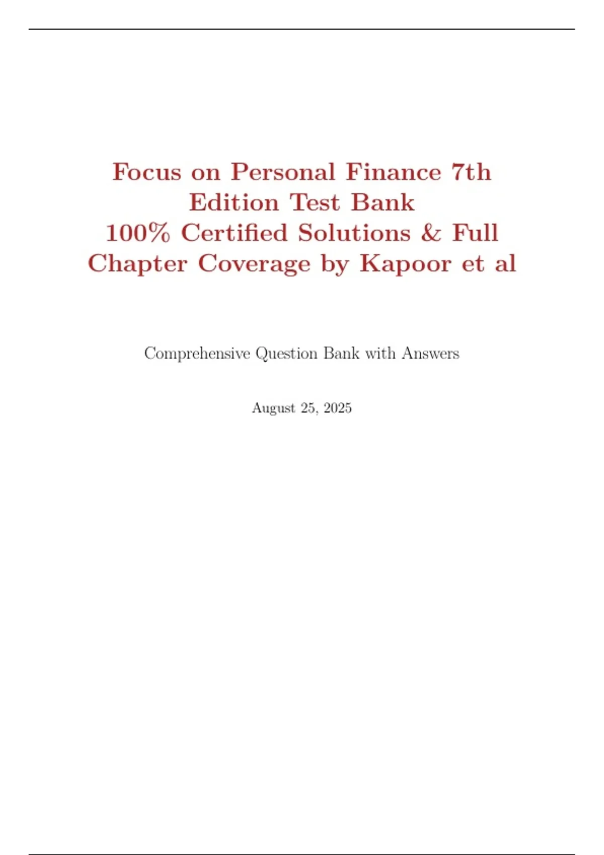 Focus on Personal Finance 7th Edition Test Bank 100% Certified Solutions & Full Chapter Coverage by Kapoor et al Comprehensive Question Bank with Answers August 25, 2025 1 Personal Financial Planning in Action 2 2 Money Management Skills 6 3 Taxes in Your Financial Plan 6 4 Savings and Payment Services 7 5 Consumer Credit 8 6 Choosing a Source of Credit 8 7 Insurance 8 8 Home and Automobile Insurance 9 9 Health and Disability Insurance 9 10 Financial Planning with Life Insurance 9 11 Investing Basics 9 12 Investing in Stocks 10 13 Investing in Bonds 10 14 Retirement and Estate Planning 10 15 Appendix: Time Value of Money 10 16 Additional Questions and Answers 11