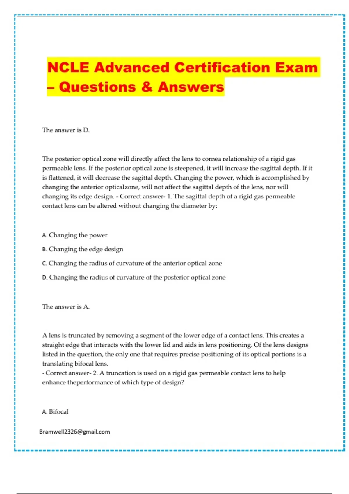 This document provides the full set of practice questions and verified correct answers for the NCLE (National Contact Lens Examiners) Advanced Certification Exam. It covers advanced contact lens fitting, specialty lens designs, ocular anatomy and physiology, keratometry, corneal topography, lens materials, patient management, and complication handling. Designed as a complete exam preparation resource, it ensures candidates are fully prepared to succeed on the NCLE Advanced certification.