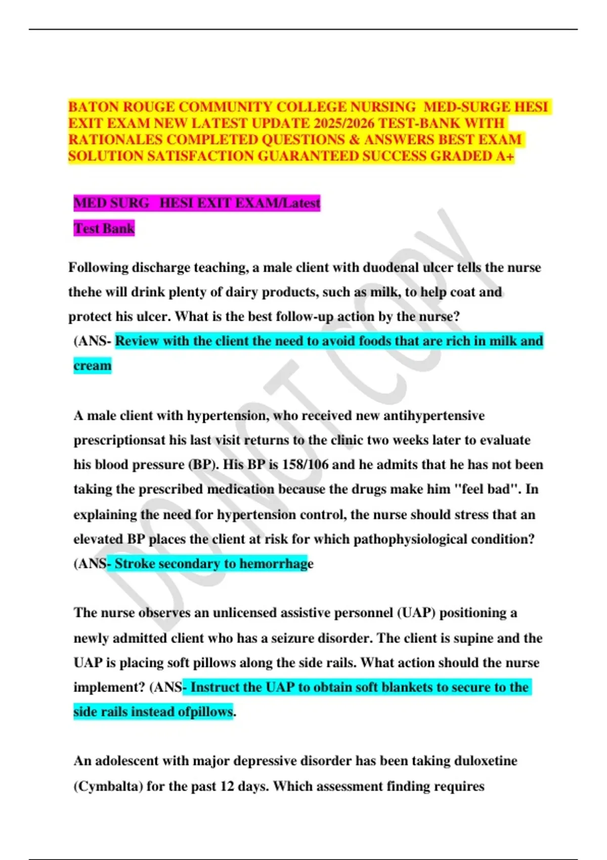 This document contains the complete test bank for the Baton Rouge Community College Nursing Med-Surg HESI Exit Exam, updated for 2025/2026. It includes fully solved questions and answers with detailed rationales to strengthen understanding and support exam success. Designed as a comprehensive preparation tool, it ensures coverage of key medical-surgical nursing concepts and provides students with reliable, exam-style practice.