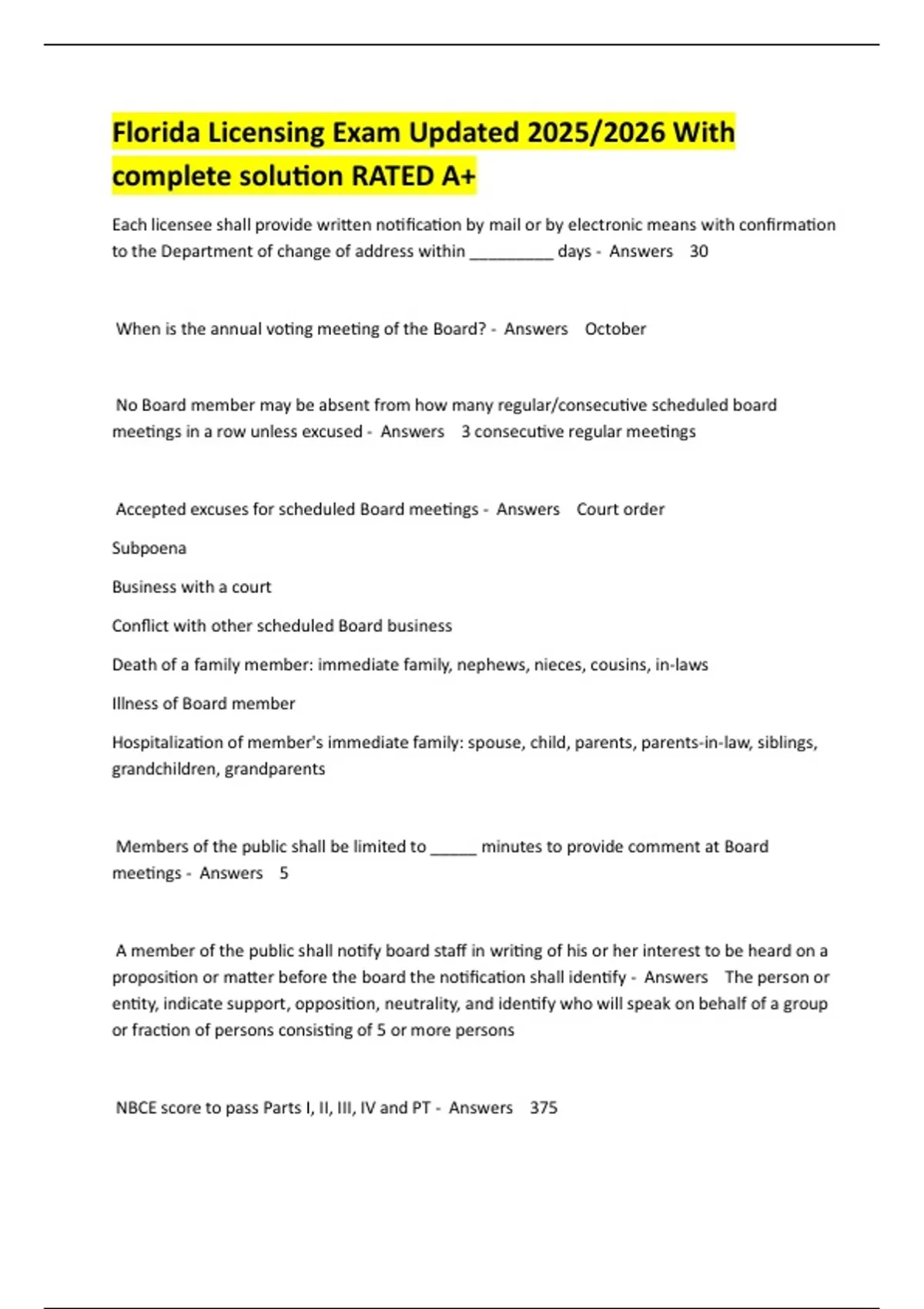Florida Licensing Exam Updated 2025/2026 With complete solution RATED A+