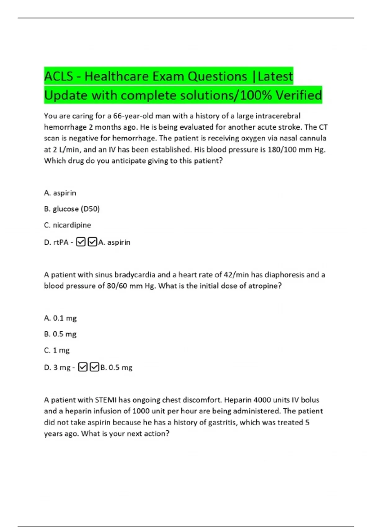 ACLS - Healthcare Exam Questions |Latest Update with complete solutions/100% Verified You are caring for a 66-year-old man with a history of a large intracerebral hemorrhage 2 months ago. He is being evaluated for another acute stroke. The CT scan is negative for hemorrhage. The patient is receiving oxygen via nasal cannula at 2 L/min, and an IV has been established. His blood pressure is 180/100 mm Hg. Which drug do you anticipate giving to this patient? A. aspirin B. glucose (D50) C. nicardipine D. rtPA -A. aspirin
