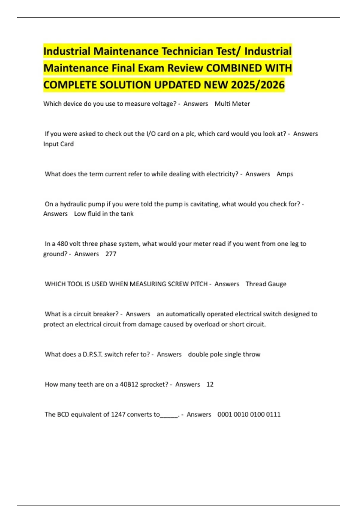 Industrial Maintenance Technician Test/ Industrial Maintenance Final Exam Review COMBINED WITH COMPLETE SOLUTION UPDATED NEW 2025/2026