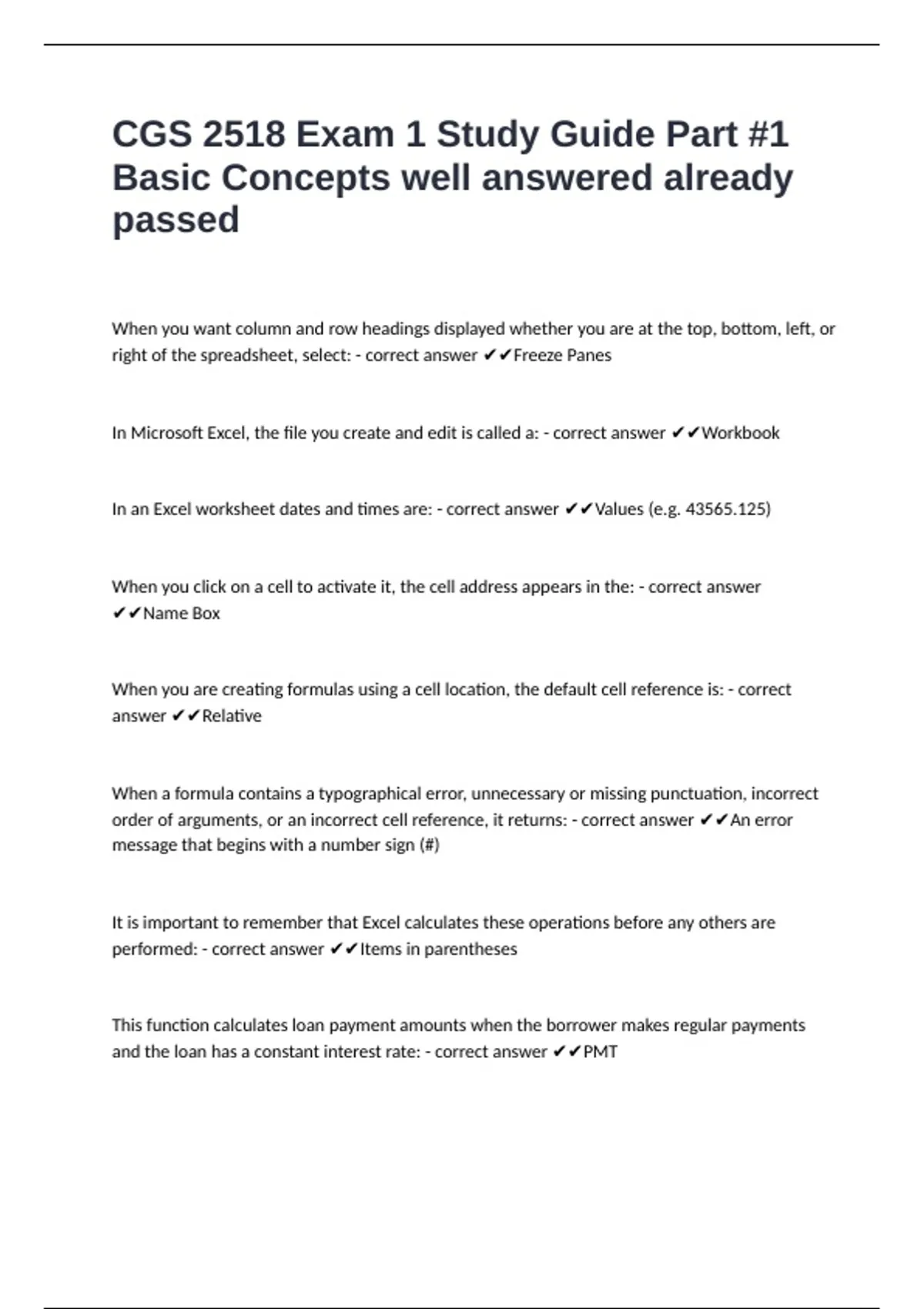 CGS 2518 Exam 1 Study Guide Part #1 Basic Concepts well answered already passed When you want column and row headings displayed whether you are at the top, bottom, left, or right of the spreadsheet, select: - correct answer Freeze Panes In Microsoft Excel, the file you create and edit is called a: - correct answer Workbook In an Excel worksheet dates and times are: - correct answer Values (e.g. 43565.125) When you click on a cell to activate it, the cell address appears in the: - correct answer Name Box When you are creating formulas using a cell location, the default cell reference is: - correct answer Relative When a formula contains a typographical error, unnecessary or missing punctuation, incorrect order of arguments, or an incorrect cell reference, it returns: - correct answer An error message that begins with a number sign (#) It is important to remember that Excel calculates these operations before any others are performed: - correct answer Items in parentheses This function calculates loan payment amounts when the borrower makes regular payments and the loan has a constant interest rate: - correct answer PMT