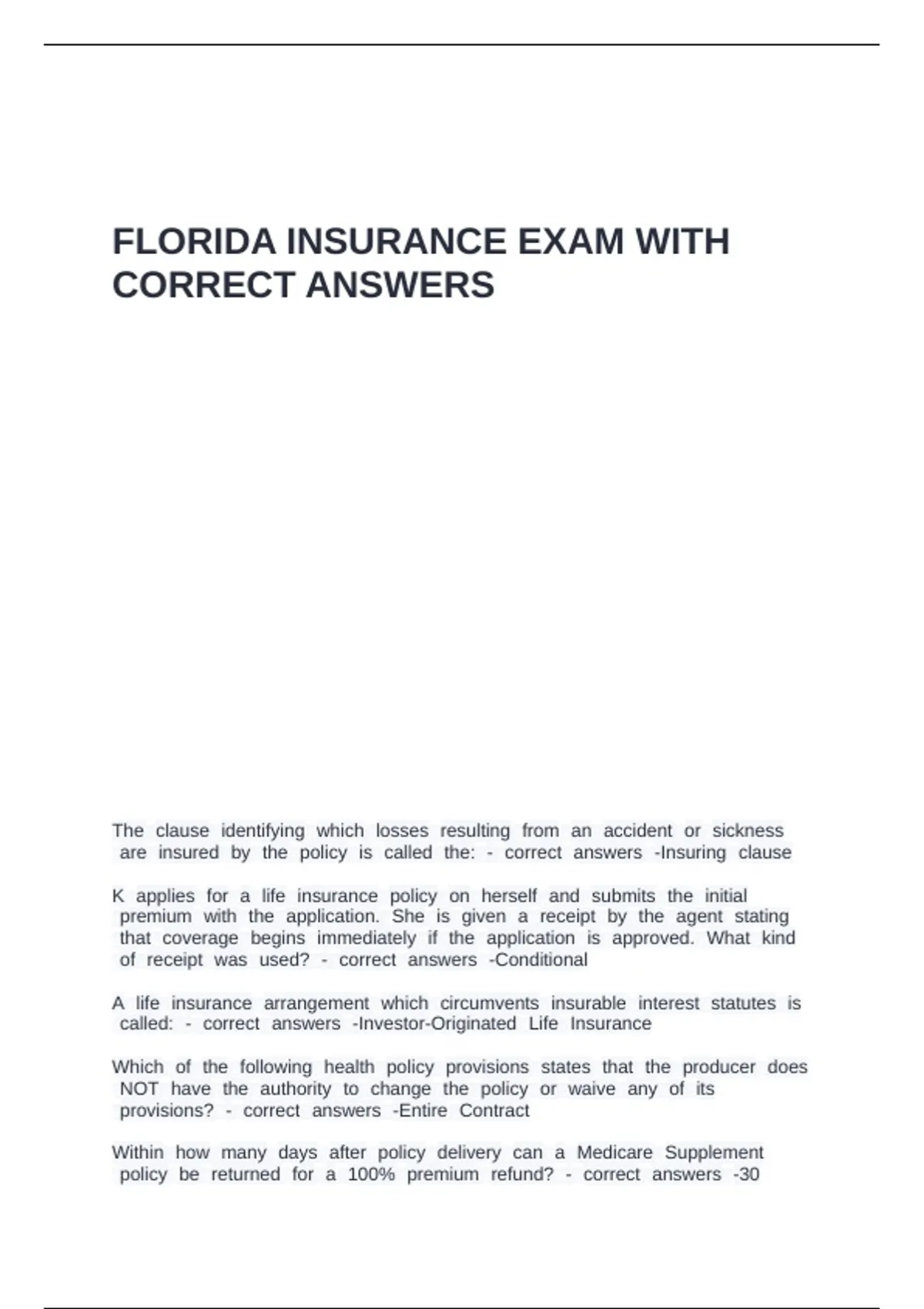 FLORIDA INSURANCE EXAM WITH CORRECT ANSWERS