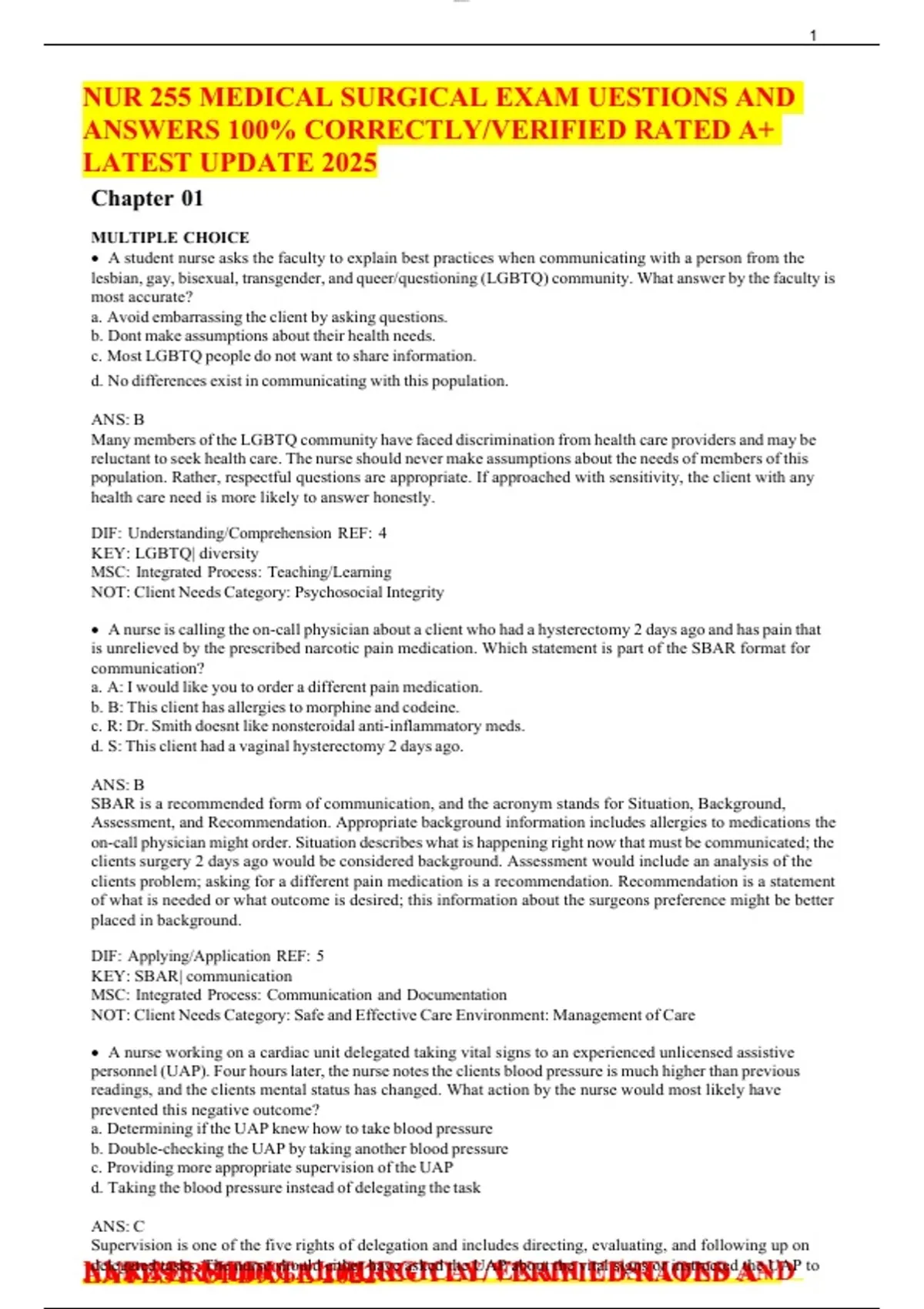 This document provides a complete set of exam questions and answers for NUR 255 Medical-Surgical Nursing. It covers key topics such as patient care, pathophysiology, diagnostic procedures, pharmacology, and nursing interventions. All answers are verified for accuracy, ensuring reliable study support. Updated for 2025, this resource helps students prepare effectively for exams with 100% correct solutions.