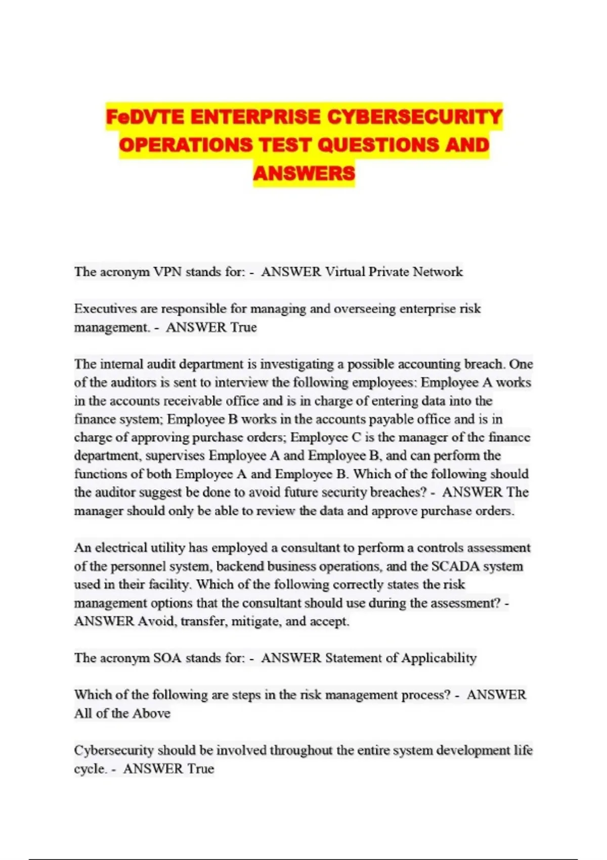 FeDVTE ENTERPRISE CYBERSECURITY OPERATIONS TEST QUESTIONS AND ANSWERS...