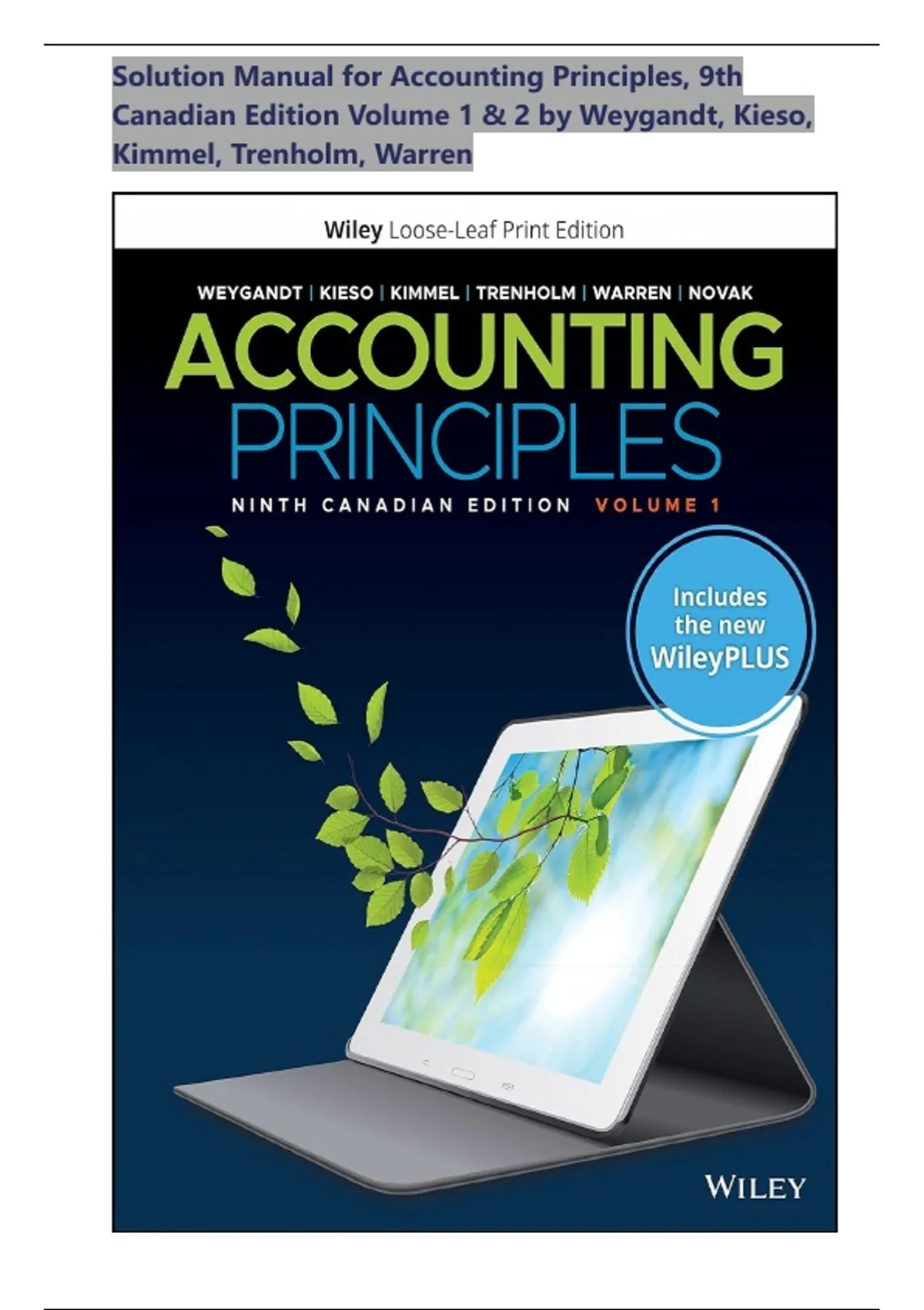 (NB: KINDLY SEND ME AN EMAIL ON IF YOU EXPERIENCE PROBLEMS TO DOWNLOAD THIS FILE SINCE IT IS VOLUMINOUS) Solution Manual for Accounting Principles, Ninth Canadian Edition Volume 1 & 2 by Weygandt, Kieso, Kimmel, Trenholm, Warren. Volume 1 1. Accounting in Action 2. The Recording Process 3. Adjusting the Accounts 4. Completion of the Accounting Cycle 5. Accounting for Merchandising Operations 6. Inventory Costing 7. Internal Control and Cash 8. Accounting for Receivables 9. Long-Lived Assets 10. Current Liabilities and Payroll: Volume 2 9. Long-Lived Assets 10. Current Liabilities and Payroll 11. Financial Reporting Concepts 12. Accounting for Partnerships 13. Introduction to Corporations 14. Corporations: Additional Topics and IFRS 15. Non-Current Liabilities 16. Investments 17. The Cash Flow Statement 18. Financial Statement Analysis PDF