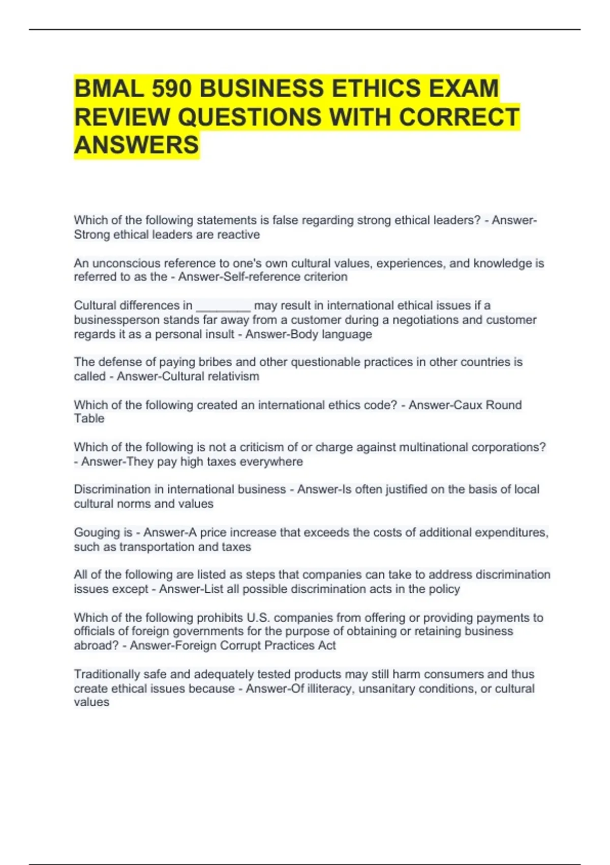 BMAL 590 BUSINESS ETHICS EXAM REVIEW QUESTIONS WITH CORRECT ANSWERS