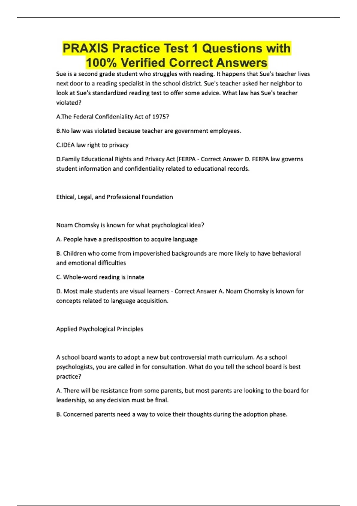 PRAXIS Practice Test 1 Questions with 100% Verified Correct Answers Sue is a second grade student who struggles with reading. It happens that Sue's teacher lives next door to a reading specialist in the school district. Sue's teacher asked her neighbor to look at Sue's standardized reading test to offer some advice. What law has Sue's teacher violated? A.The Federal Confideniality Act of 1975? B.No law was violated because teacher are government employees. C.IDEA law right to privacy D.Family Educational Rights and Privacy Act (FERPA - Correct Answer D. FERPA law governs student information and confidentiality related to educational records. Ethical, Legal, and Professional Foundation Noam Chomsky is known for what psychological idea? A. People have a predisposition to acquire language B. Children who come from impoverished backgrounds are more likely to have behavioral and emotional difficulties C. Whole-word reading is innate D. Most male students are visual learners - Correct Answer A. Noam Chomsky is known for concepts related to language acquisition. Applied Psychological Principles