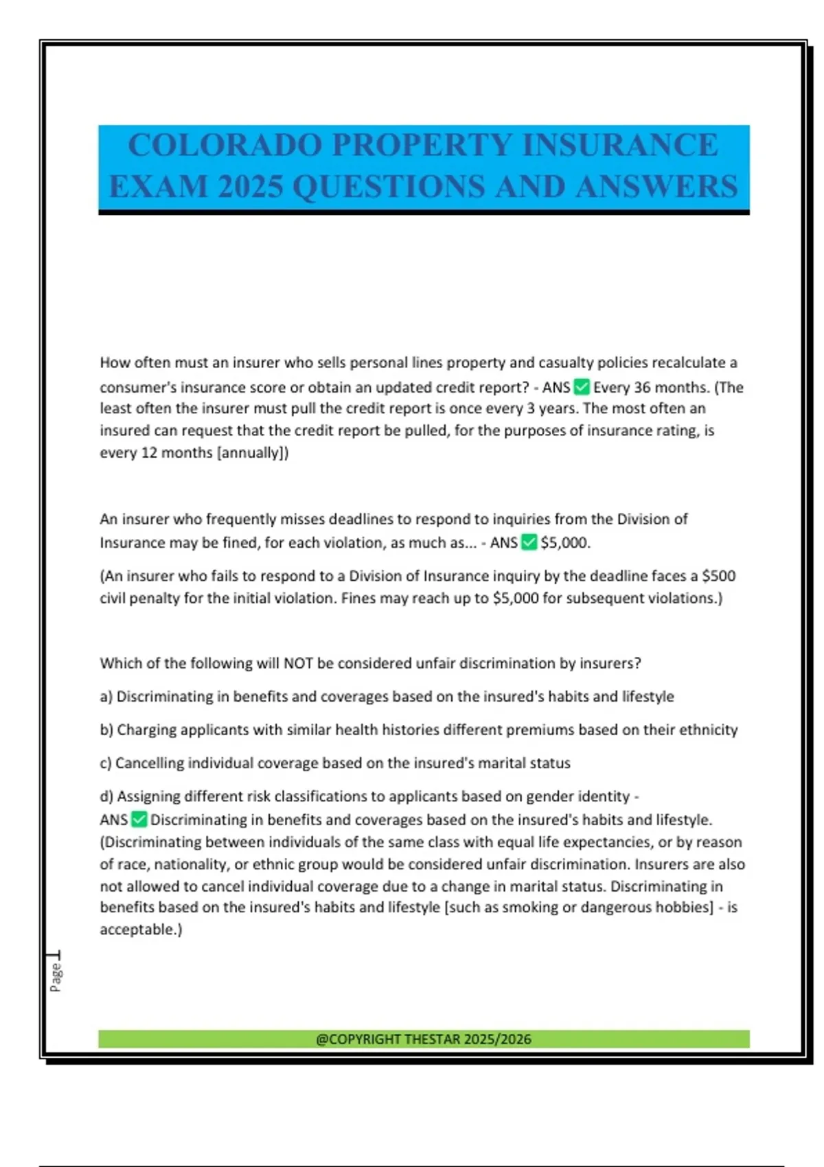 How often must an insurer who sells personal lines property and casualty policies recalculate a consumer's insurance score or obtain an updated credit report? - ANS Every 36 months. (The least often the insurer must pull the credit report is once every 3 years. The most often an insured can request that the credit report be pulled, for the purposes of insurance rating, is every 12 months [annually]) An insurer who frequently misses deadlines to respond to inquiries from the Division of Insurance may be fined, for each violation, as much as... - ANS $5,000. (An insurer who fails to respond to a Division of Insurance inquiry by the deadline faces a $500 civil penalty for the initial violation. Fines may reach up to $5,000 for subsequent violations.) Which of the following will NOT be considered unfair discrimination by insurers? a) Discriminating in benefits and coverages based on the insured's habits and lifestyle b) Charging applicants with similar health histories different premiums based on their ethnicity c) Cancelling individual coverage based on the insured's marital status d) Assigning different risk classifications to applicants based on gender identity - ANS Discriminating in benefits and coverages based on the insured's habits and lifestyle. (Discriminating between individuals of the same class with equal life expectancies, or by reason of race, nationality, or ethnic group would be considered unfair discrimination. Insurers are also not allowed to cancel individual coverage due to a change in marital status. Discriminating in benefits based on the insured's habits and lifestyle [such as smoking or dangerous hobbies] - is acceptable.) @COPYRIGHT THESTAR 2025/2026 Page2 An insurer wishes to cancel a Commercial General Liability Policy. This policy has been in effect for more than 60 days and the cancellation is due to a reason other than nonpayment of premium. How many days before the effective date of cancellation must the insurer send notice of cancellation to the insured? - ANS 45 days. For how many years must a producer keep supporting documentation of his or her continuing education completion? - ANS 5 years following license continuation. (It is the responsibility of the producer to maintain records sufficient to document successful completion of 24 credit hours on a biennial basis. Supporting documentation must be maintained by the producer for 5 years following license continuation and must be available for audit by the Division of Insurance or the Continuing Education Administrator.) Under Colorado's Unfair Claims Practices regulations, when denying a claim an insurer must do all of the following EXCEPT... a) Respond promptly to claims communications. b) Conduct a reasonable investigation. c) Pay a claim that occurs after the grace period has ended. d) Indicate to the claimant which section of the policy they are relying upon. - ANS Pay a claim that occurs after the grace period has ended. (A claim that occurs during a grace period of a policy is covered, the insurer will simply deduct premium owed from the claim and pay the rest up to a limit, if one is indicated on the policy. Once the grace period ends, a policy expires and no further claims are valid.) As a condition of initial licensure, an individual applicant for a producer license in one line of authority will be required to complete approved prelicensing education of how many hours? - ANS 50 hours! (A total of 50 hours of an approved course is required as a condition of initial licensure. Of the 50 hours, at least 3 hours will pertain specifically to ethics and 4 hours will pertain specifically to state laws related to the line of authority.) The process of determining the premium charged and how much insurance is required for a particular loss is called...? - ANS Loss valuation. (Loss valuation is the process of determining appropriate monetar