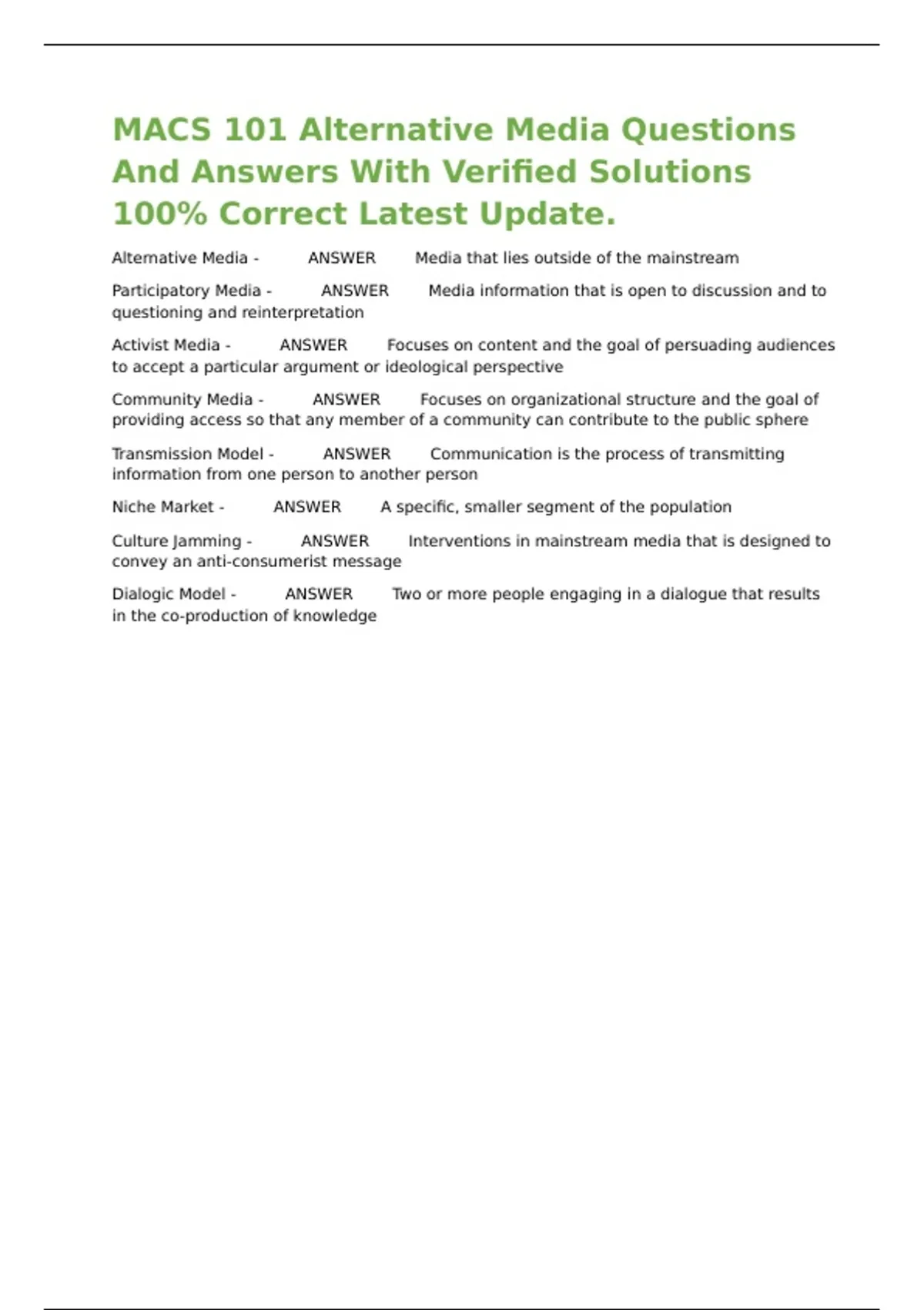 MACS 101 Alternative Media Questions And Answers With Verified Solutions 100% Correct Latest Update.
