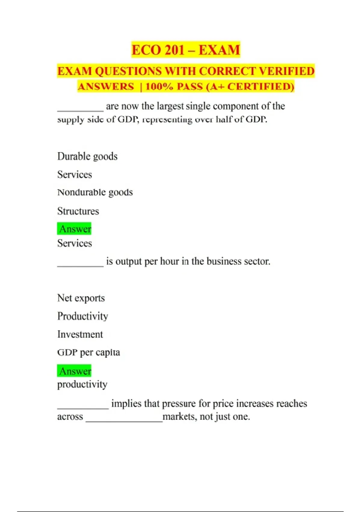 ECO 201 – EXAM EXAM QUESTIONS WITH CORRECT VERIFIED ANSWERS | 100% PASS (A+ CERTIFIED) _________ are now the largest single component of the supply side of GDP, representing over half of GDP. Durable goods Services Nondurable goods Structures Answer Services _________ is output per hour in the business sector. Net exports Productivity Investment GDP per capita Answer productivity __________ implies that pressure for price increases reaches across _______________markets, not just one. inflation; all deflation; most inflation; most deflation; all Answer inflation; most ___________ is a small category that refers to the goods produced by one business that have yet to be sold to consumers, and are either still sitting in warehouses and on store shelves. Inventories Services Structures Durable goods Answer Inventories ___________ is about two-thirds of the demand side of GDP, but it moves relatively little over time. Government Consumption Investment Services Answer Consumption _____________________ is a term which refers to the widespread use of power-driven machinery and the economic and social changes that resulted in the first half of the 1800s. GDP per capita The Industrial Revolution The living standard Investment and inventions Answer The Industrial Revolution ______________________ argues that the productivity of workers will increase if they are paid more, and so employers will often find it worthwhile to pay their employees somewhat more than market conditions might dictate. Efficiency wage theory Equilibrium wage theory Employee wage theory Employer wage theory Answer Efficiency wage theory _______________, which can be approximated by the growth of gross domestic product, ultimately determines the prevailing standard of living in a country. Trade balance Inflation Education Economic growth Answer Economic growth 5 categories of produces Answer durable goods, nondurable goods, services, structures, and the change in inventories A business cycle reflects changes in economic activity, particularly real GDP. The stages of a business cycle are: trough, expansion, recession, peak contraction, recession, expansion, boom expansion, trough, recession, peak expansion, peak, recession, trough Answer expansion, peak, recession, trough A country will roughly double its GDP in twenty years if its annual growth rate is: 12 percent. 7.5 percent. 3.5 percent. 2.5 percent. Answer 3.5 percent Use rule of 72 Formula years to double = 72/annual growth rate 20 = 72/annual growth rate 72/20 = 3.5% A depreciating U.S. dollar is ________________ because it is
