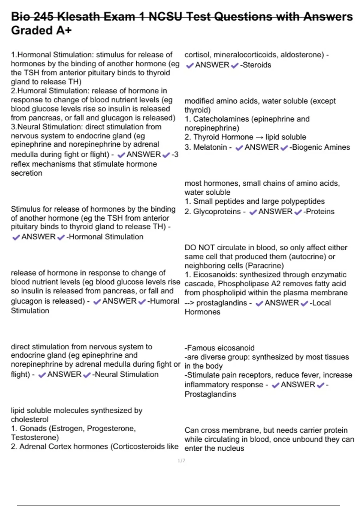 , Bio 245 Klesath Exam 1 NCSU Test Questions with Answers