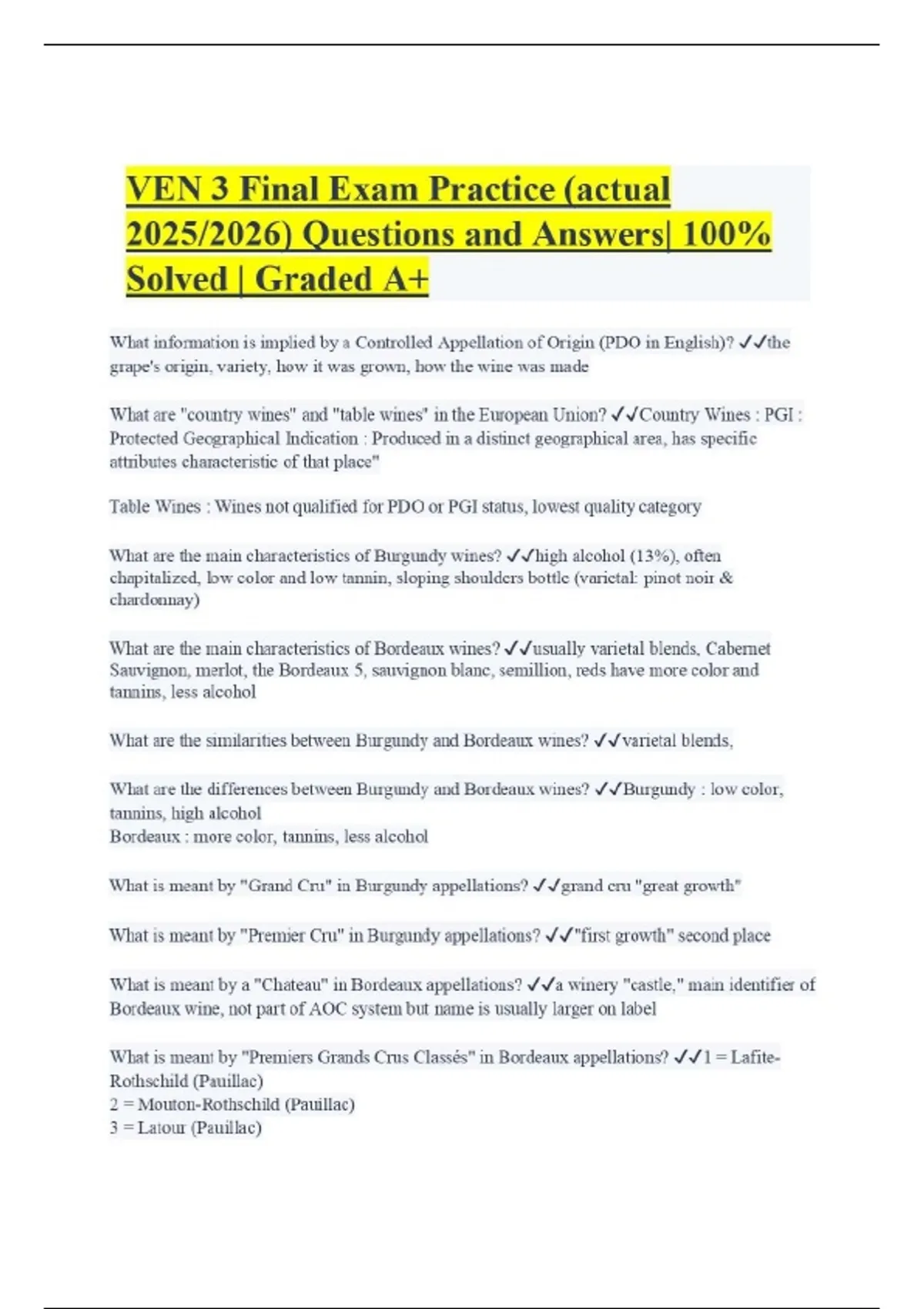 VEN 3 Final Exam Practice (actual 2025/2026) Questions and Answers| 100% Solved | Graded A+ What information is implied by a Controlled Appellation of Origin (PDO in English)? the grape's origin, variety, how it was grown, how the wine was made What are "country wines" and "table wines" in the European Union? Country Wines : PGI : Protected Geographical Indication : Produced in a distinct geographical area, has specific attributes characteristic of that place" Table Wines : Wines not qualified for PDO or PGI status, lowest quality category What are the main characteristics of Burgundy wines? high alcohol (13%), often chapitalized, low color and low tannin, sloping shoulders bottle (varietal: pinot noir & chardonnay)