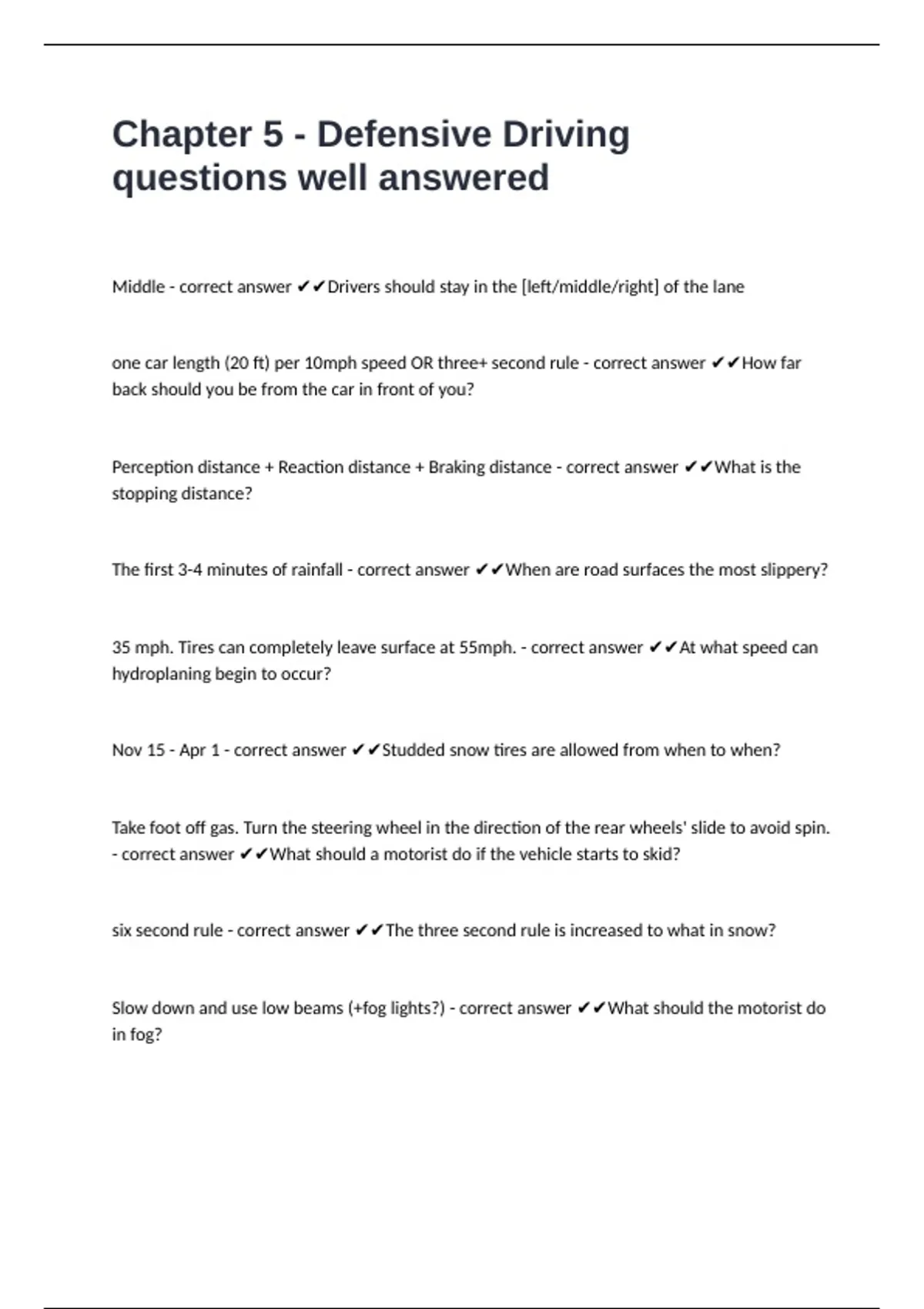 Chapter 5 - Defensive Driving questions well answeredMiddle - correct answer Drivers should stay in the [left/middle/right] of the lane one car length (20 ft) per 10mph speed OR three+ second rule - correct answer How far back should you be from the car in front of you? Perception distance + Reaction distance + Braking distance - correct answer What is the stopping distance? The first 3-4 minutes of rainfall - correct answer When are road surfaces the most slippery? 35 mph. Tires can completely leave surface at 55mph. - correct answer At what speed can hydroplaning begin to occur? Nov 15 - Apr 1 - correct answer Studded snow tires are allowed from when to when? Take foot off gas. Turn the steering wheel in the direction of the rear wheels' slide to avoid spin. - correct answer What should a motorist do if the vehicle starts to skid? six second rule - correct answer The three second rule is increased to what in snow?