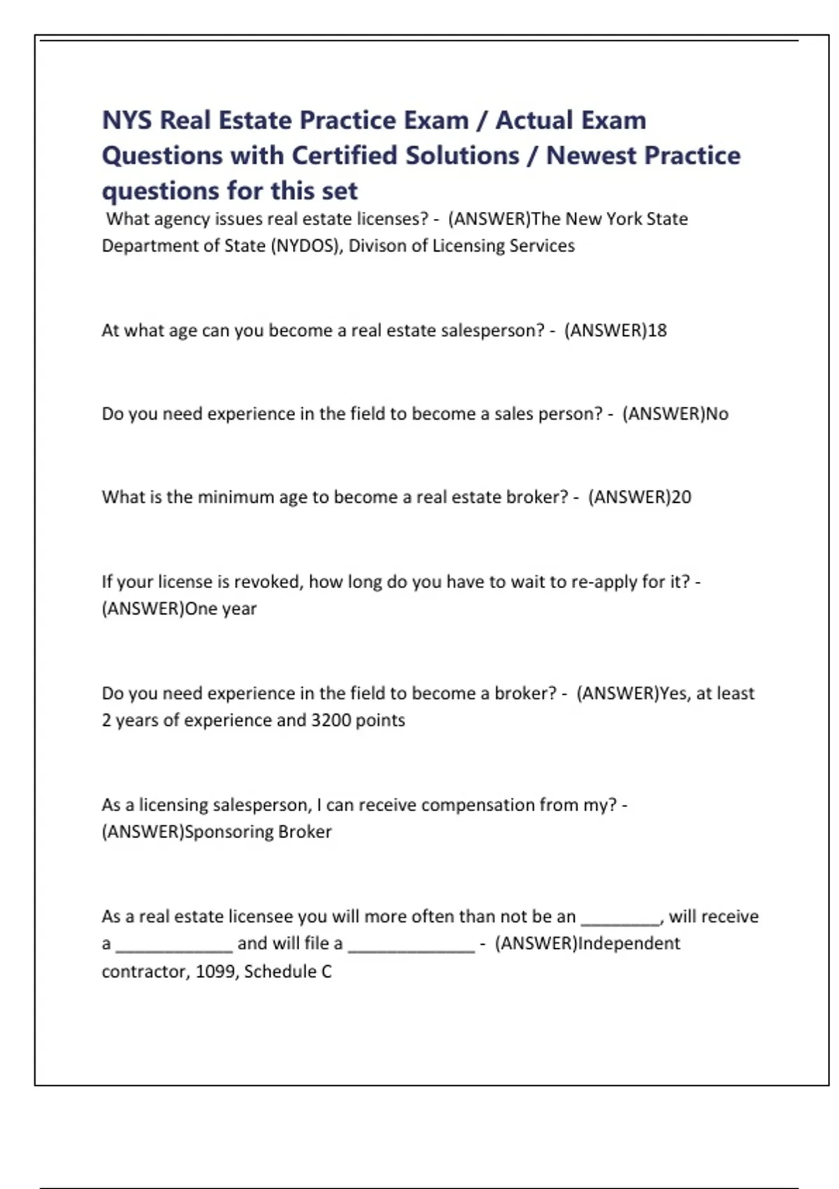 NYS Real Estate Practice Exam / Actual Exam