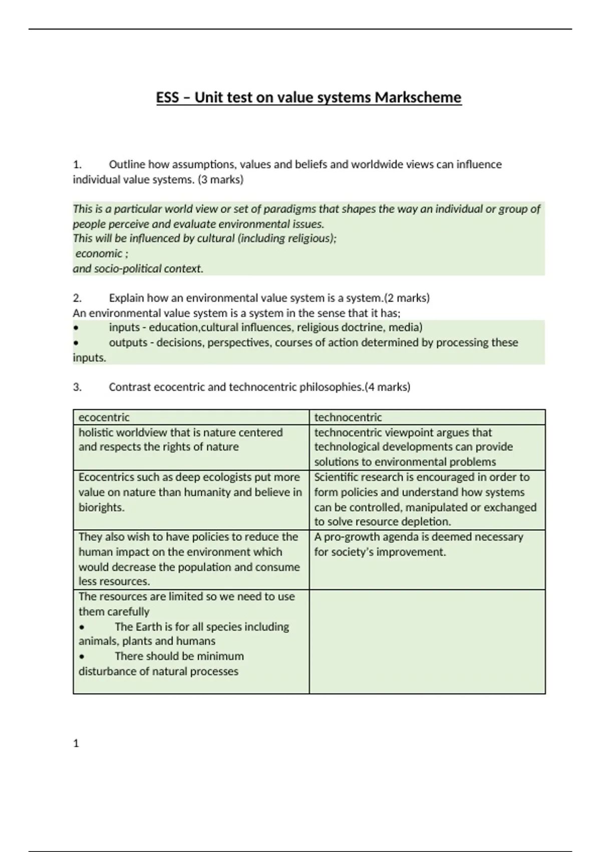ESS – Unit test on value systems Markscheme