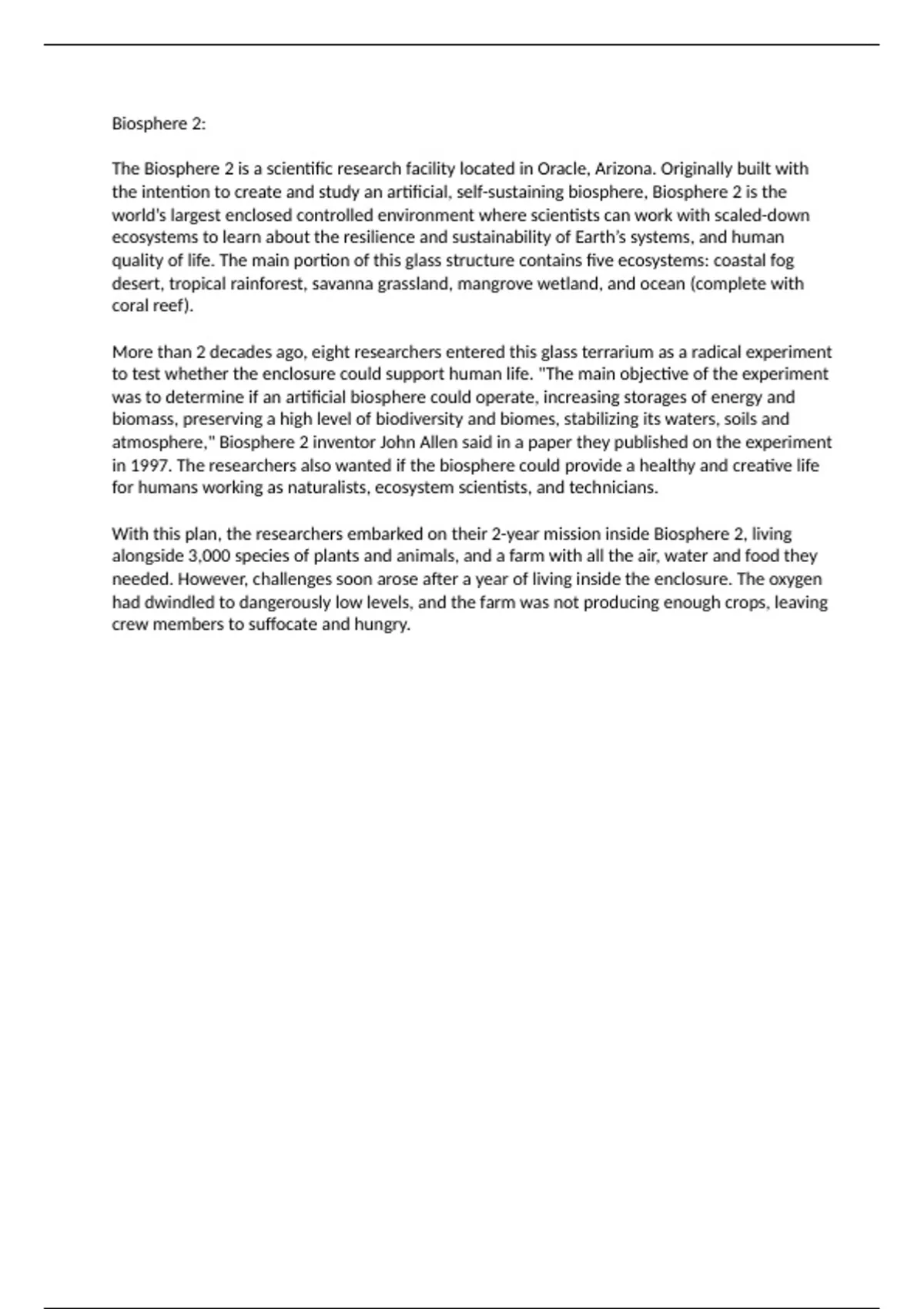 This essay provides a clear and detailed analysis of Biosphere 2, the world’s largest enclosed research facility designed to study self-sustaining ecosystems. It examines the five ecosystems inside the structure—coastal fog desert, tropical rainforest, savanna grassland, mangrove wetland, and ocean with a coral reef—and how they function together to support life. The essay also covers the two-year experiment in which eight researchers lived entirely within Biosphere 2, highlighting challenges such as low oxygen levels and insufficient crop production, and what these challenges reveal about maintaining closed ecosystems. Ideal for students studying ecology, environmental science, or sustainability, this essay connects scientific objectives, practical challenges, and human experiences in a clear, well-organized way, providing helpful insights for understanding artificial ecosystems.
