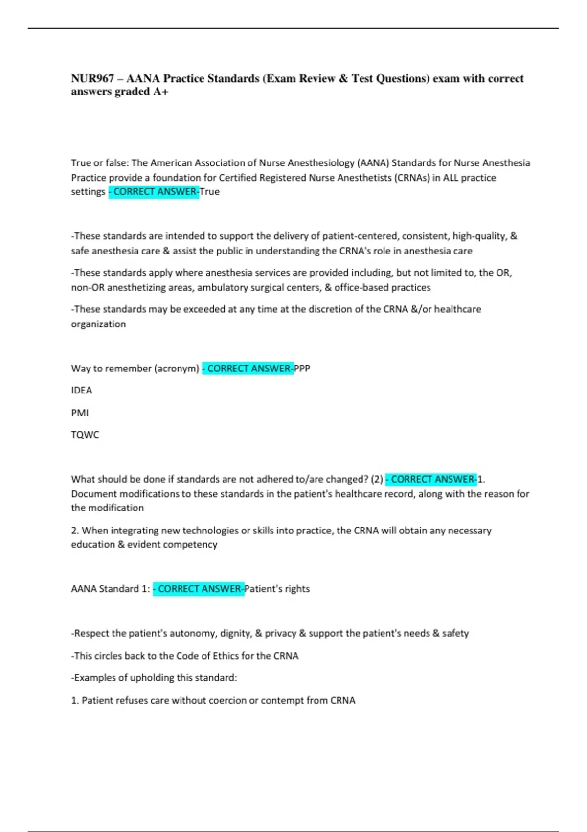 NUR967 – AANA Practice Standards (Exam Review & Test Questions) exam with correct answers graded A+.