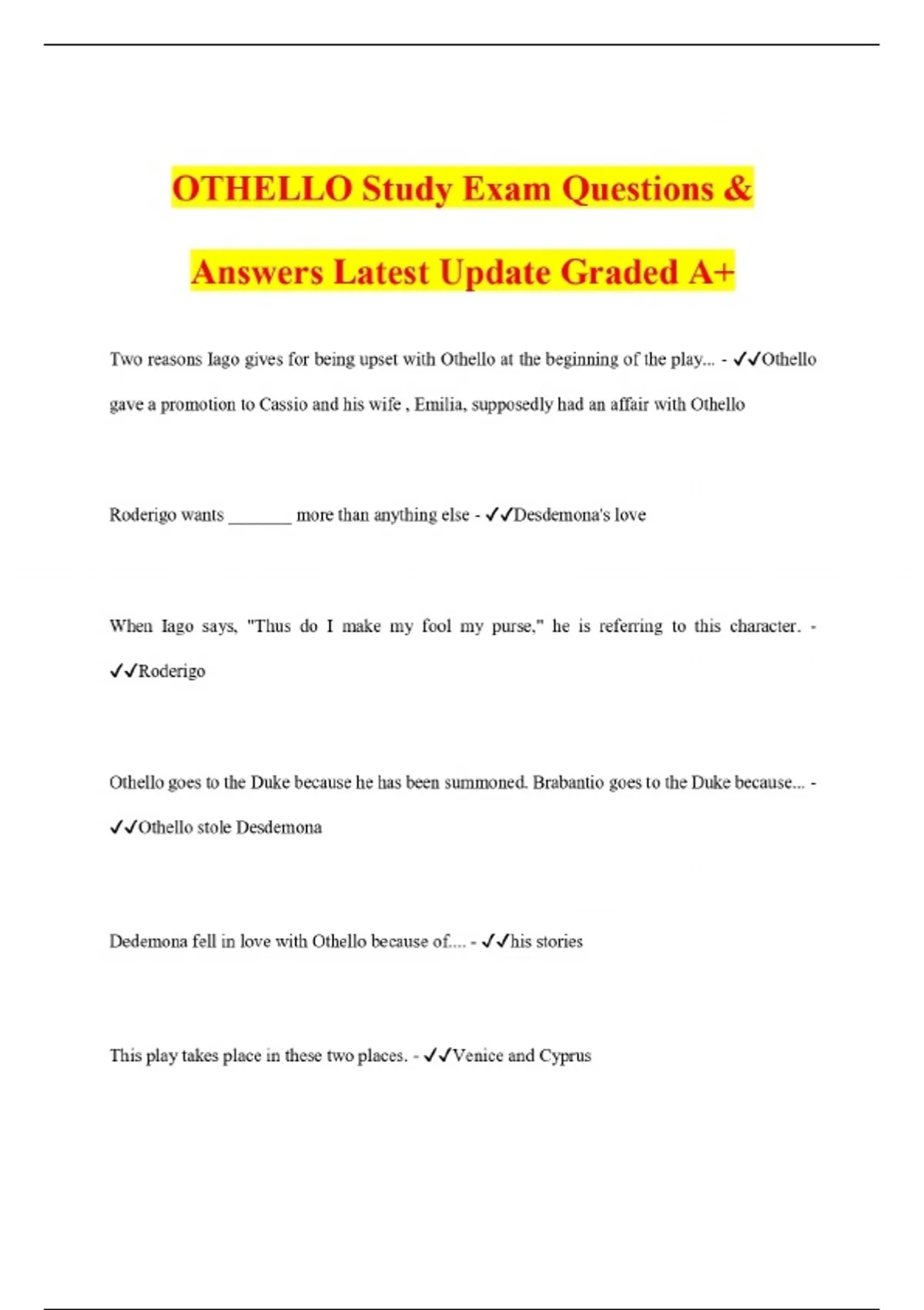 OTHELLO Study Exam Questions & Answers Latest Update Graded A+