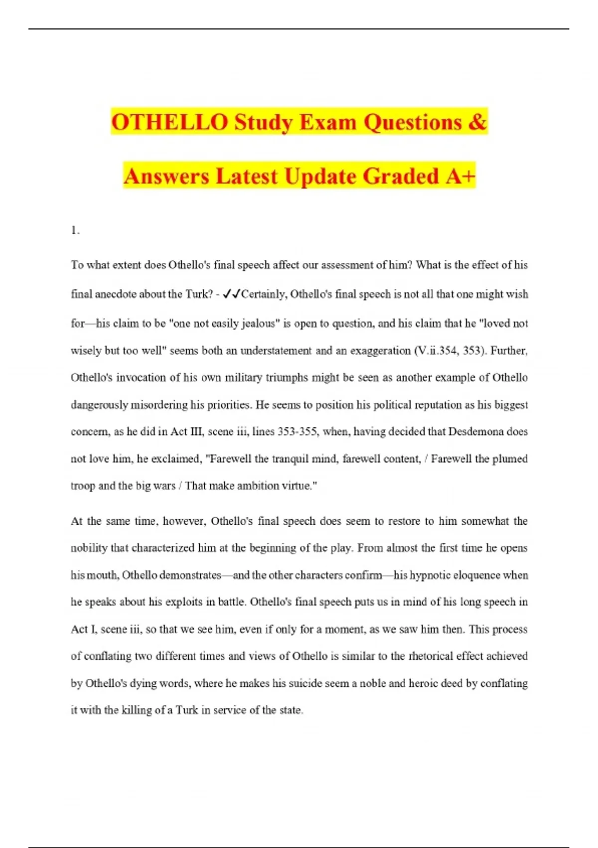 OTHELLO Study Exam Questions & Answers Latest Update Graded A+