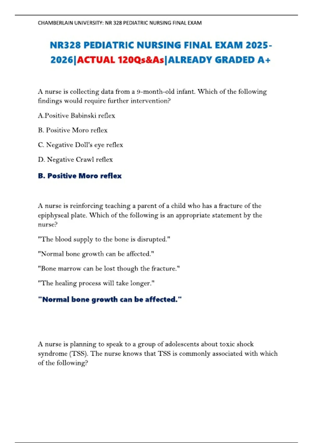 NR328 PEDIATRIC NURSING FINAL EXAM |ACTUAL 120Qs&As|ALREADY GRADED A+