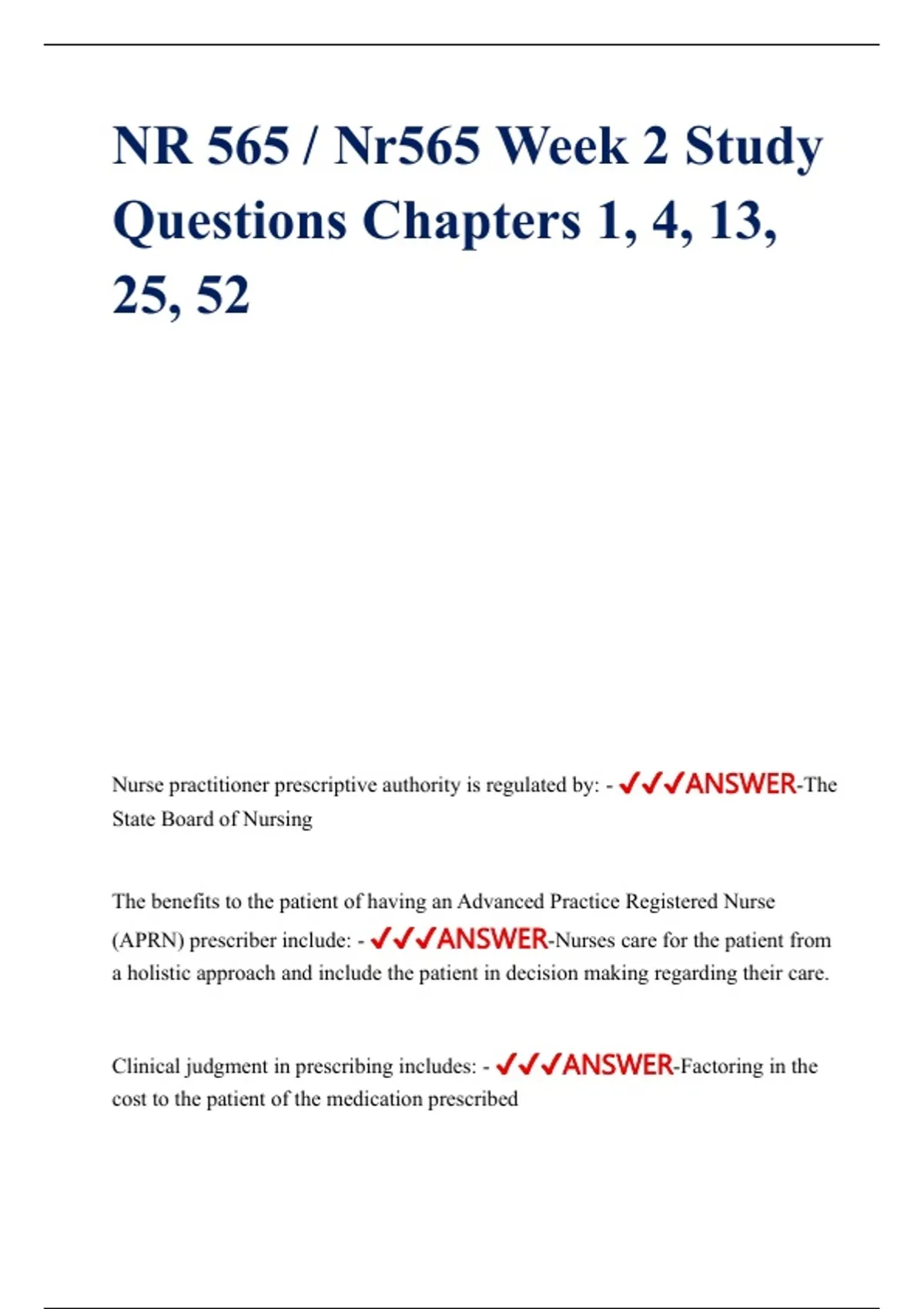 NR 565 / Nr565 Week 2 Study Questions Chapters 1, 4, 13, 25, 52