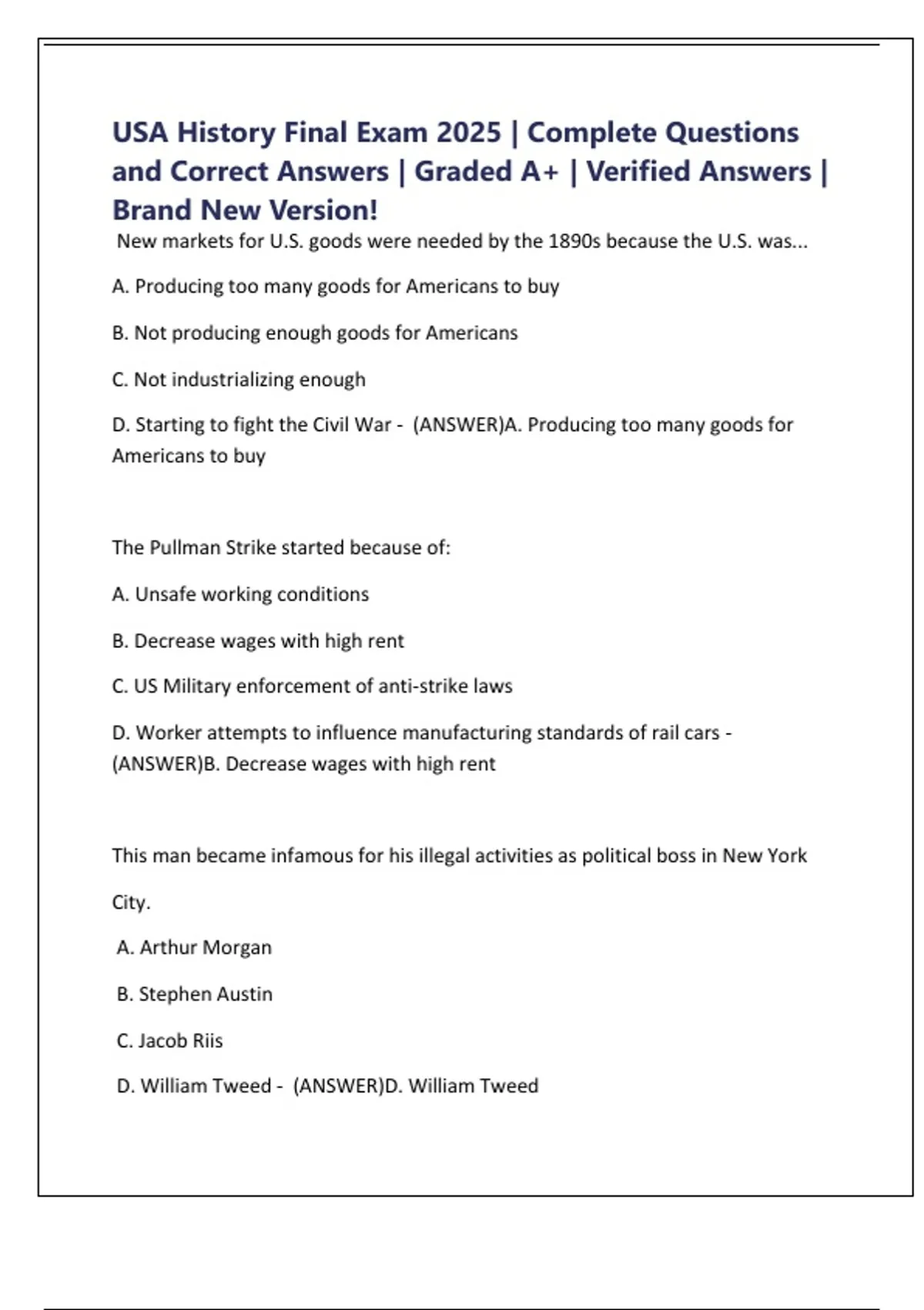 USA History Final Exam 2025 | Complete Questions