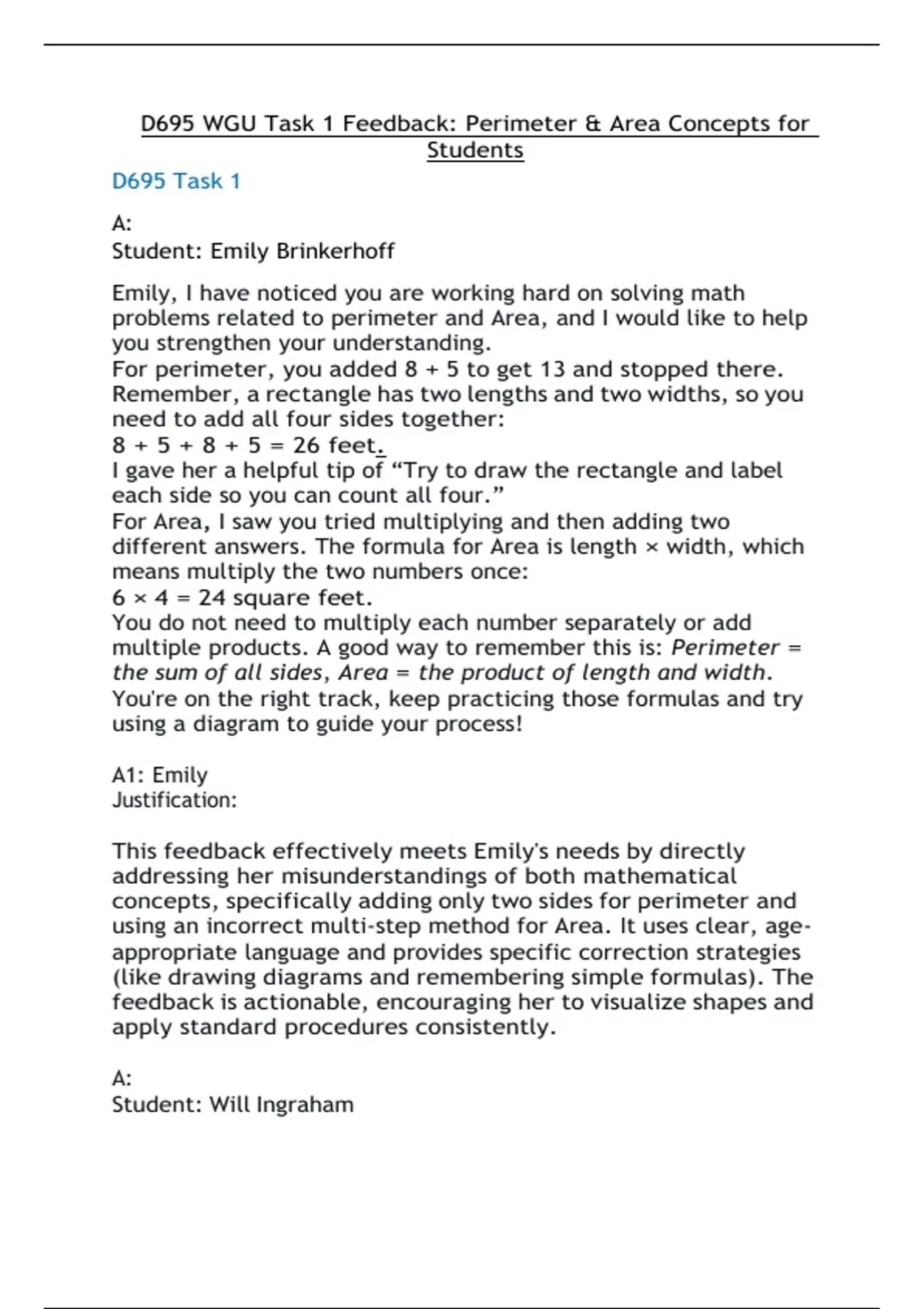 D695 WGU Task 1 Feedback: Perimeter & Area Concepts for Students