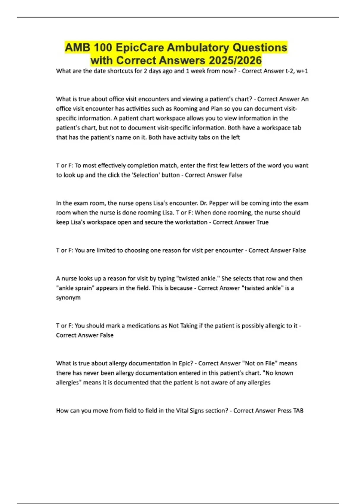AMB 100 EpicCare Ambulatory Questions with Correct Answers 2025/2026