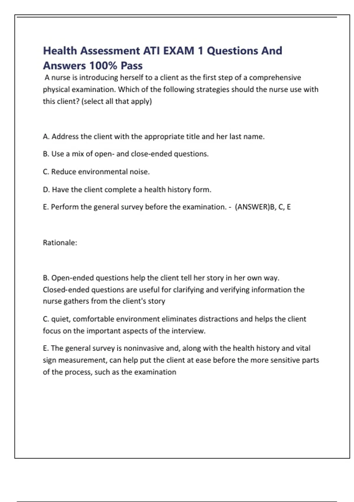 Health Assessment ATI EXAM 1 Questions And