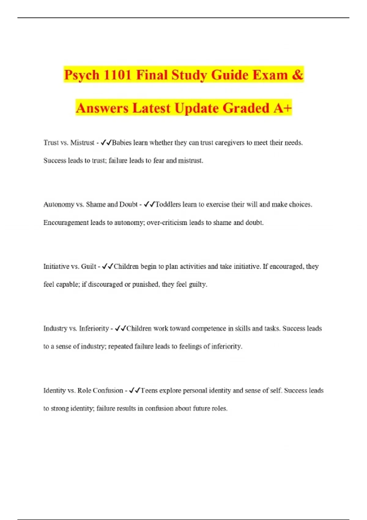 Psych 1101 Final Study Guide Exam & Answers Latest Update Graded A+