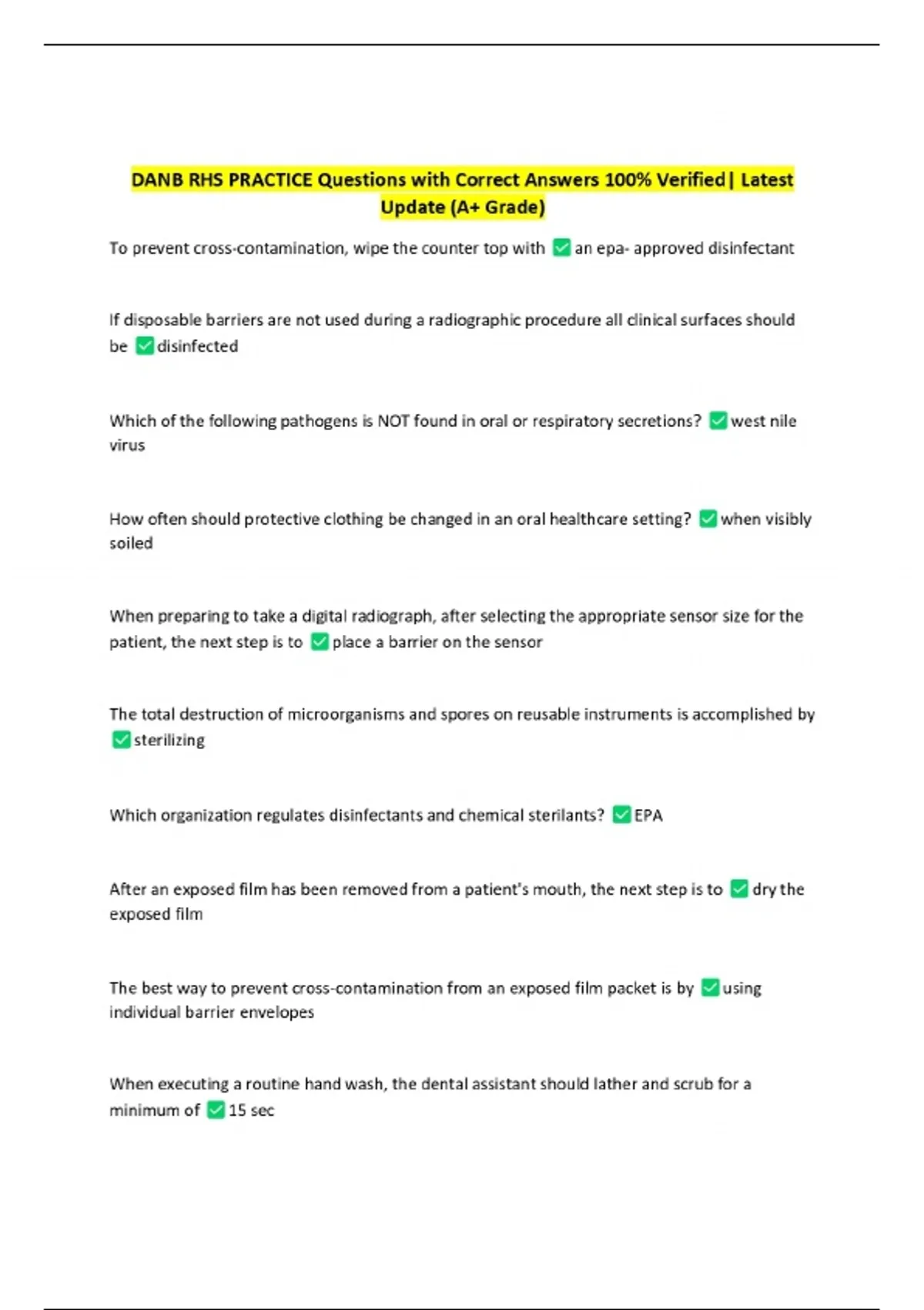 DANB RHS PRACTICE Questions with Correct Answers 100% Verified| Latest Update (A+ Grade)