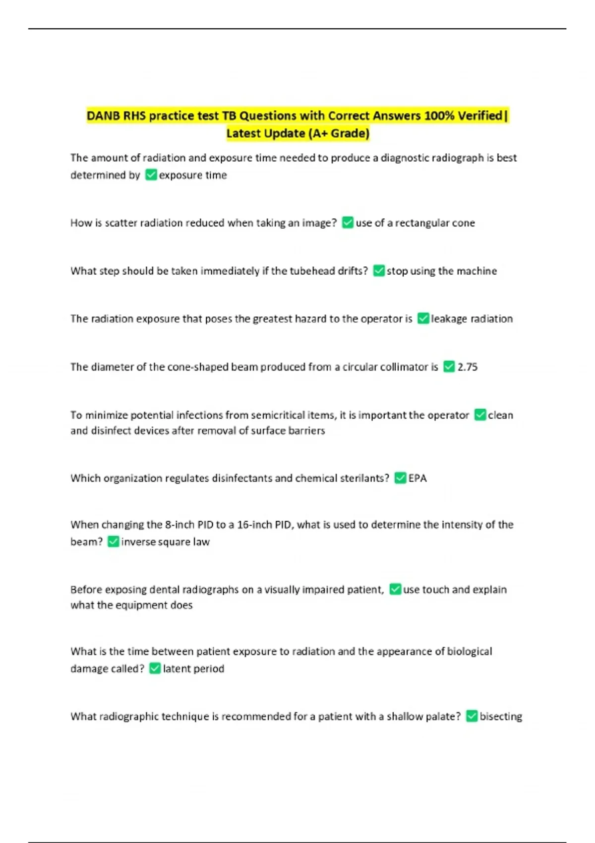 DANB RHS practice test TB Questions with Correct Answers 100% Verified| Latest Update (A+ Grade)