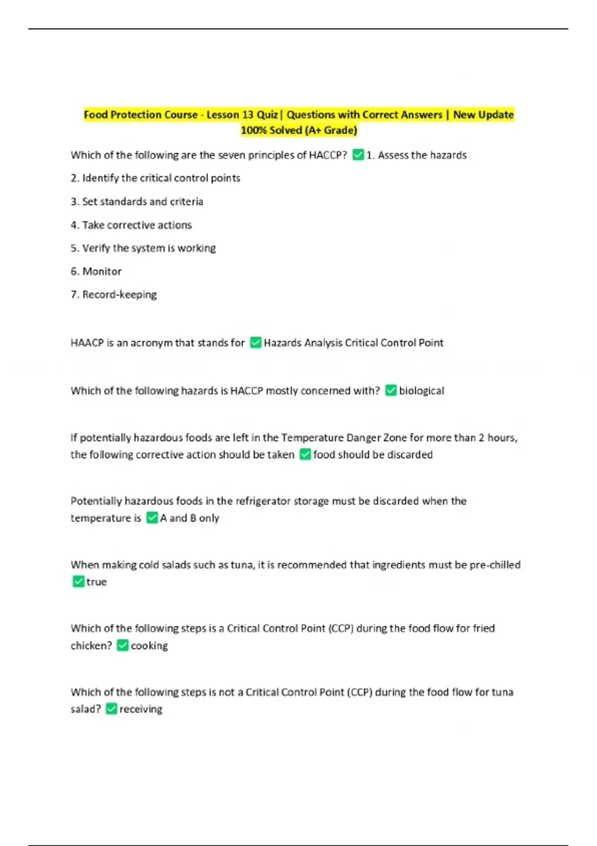 Food Protection Course - Lesson 13 Quiz| Questions with Correct Answers | New Update 100% Solved (A+ Grade)
