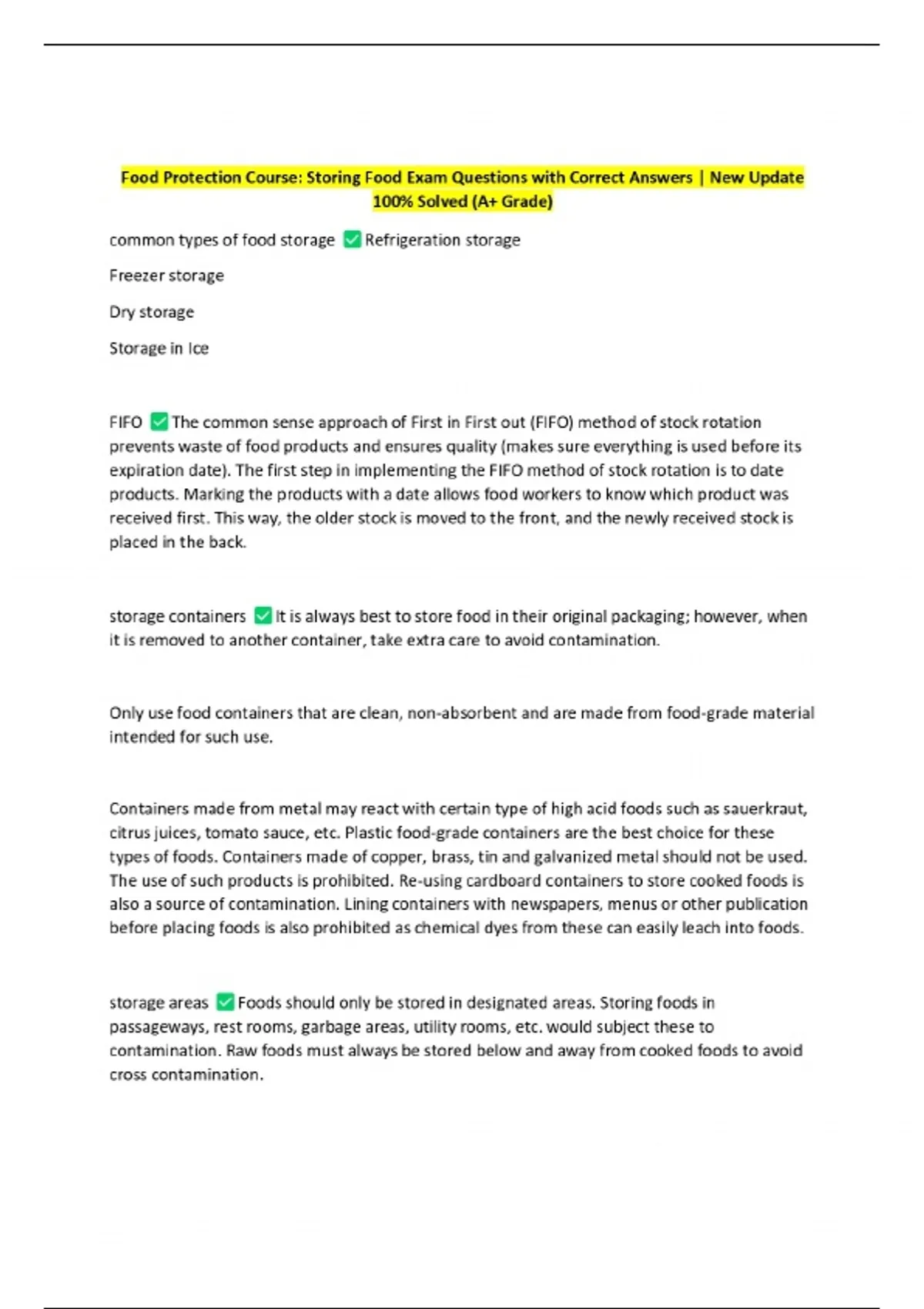 Food Protection Course: Storing Food Exam Questions with Correct Answers | New Update 100% Solved (A+ Grade)