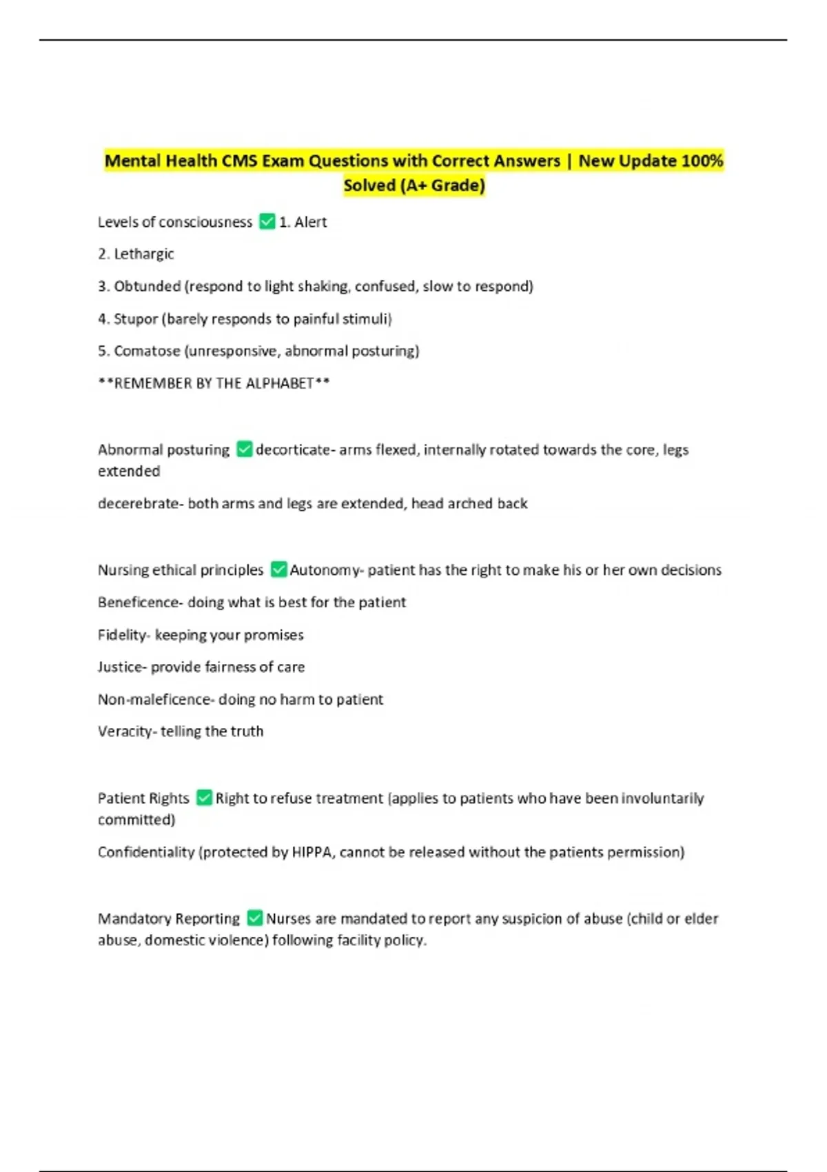 Mental Health CMS Exam Questions with Correct Answers | New Update 100% Solved (A+ Grade)