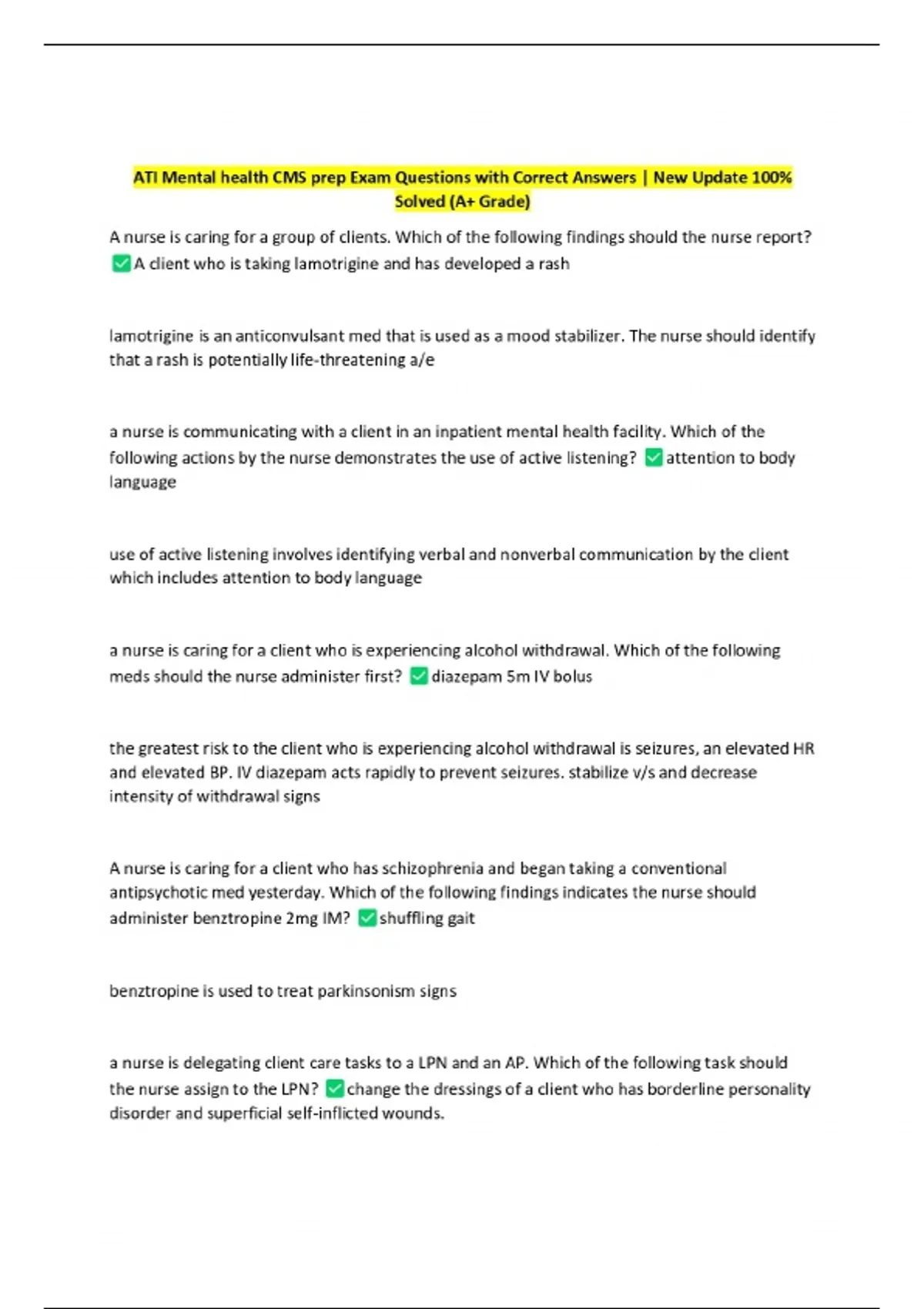 ATI Mental health CMS prep Exam Questions with Correct Answers | New Update 100% Solved (A+ Grade)