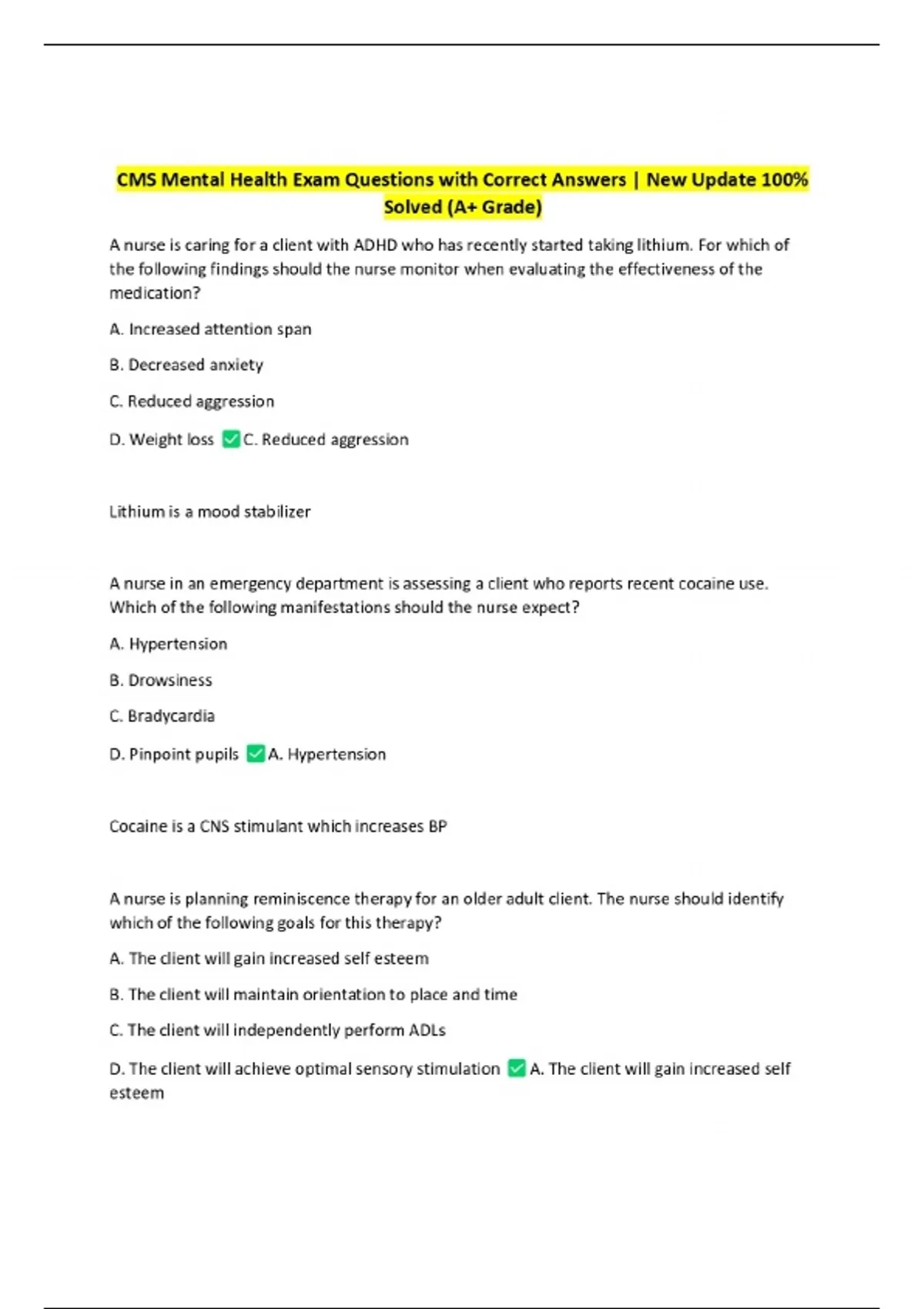 CMS Mental Health Exam Questions with Correct Answers | New Update 100% Solved (A+ Grade)