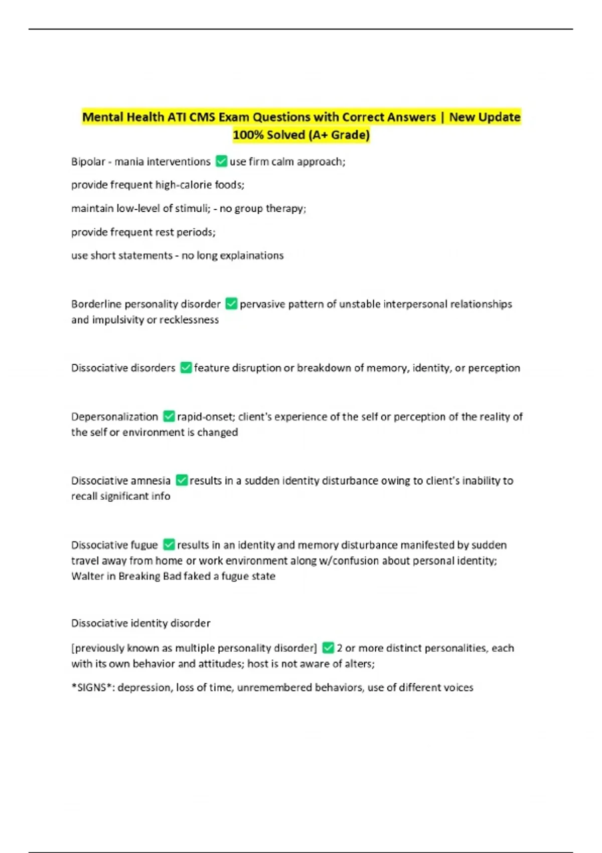 Mental Health ATI CMS Exam Questions with Correct Answers | New Update 100% Solved (A+ Grade)