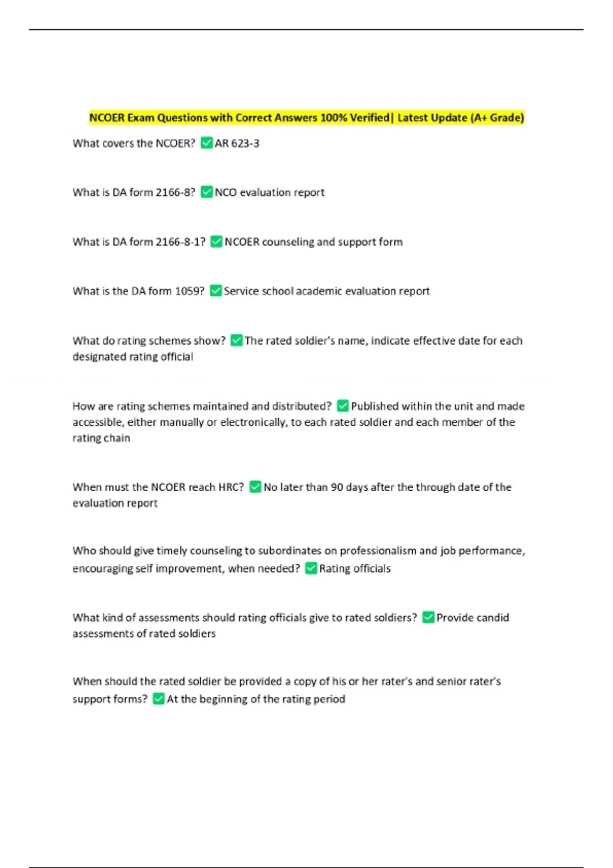 NCOER Exam Questions with Correct Answers 100% Verified| Latest Update (A+ Grade)